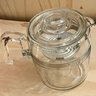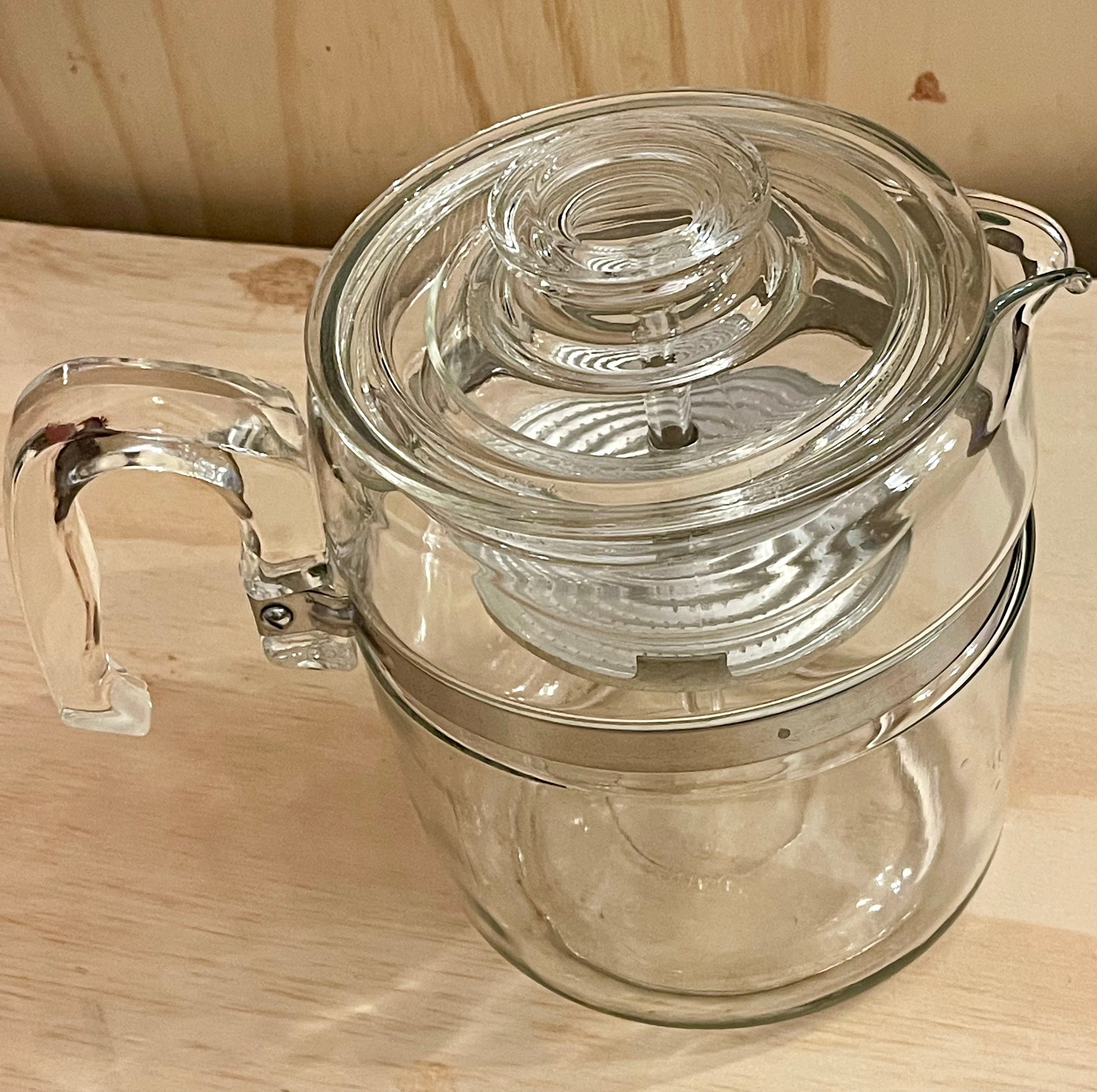 Vintage Pyrex Flameware stovetop glass coffee percolator, complete with glass lid, internal stem, basket, and original metal support band. Designed for direct stovetop use, this clear glass brew pot allows you to watch the percolation process as your coffee brews.
