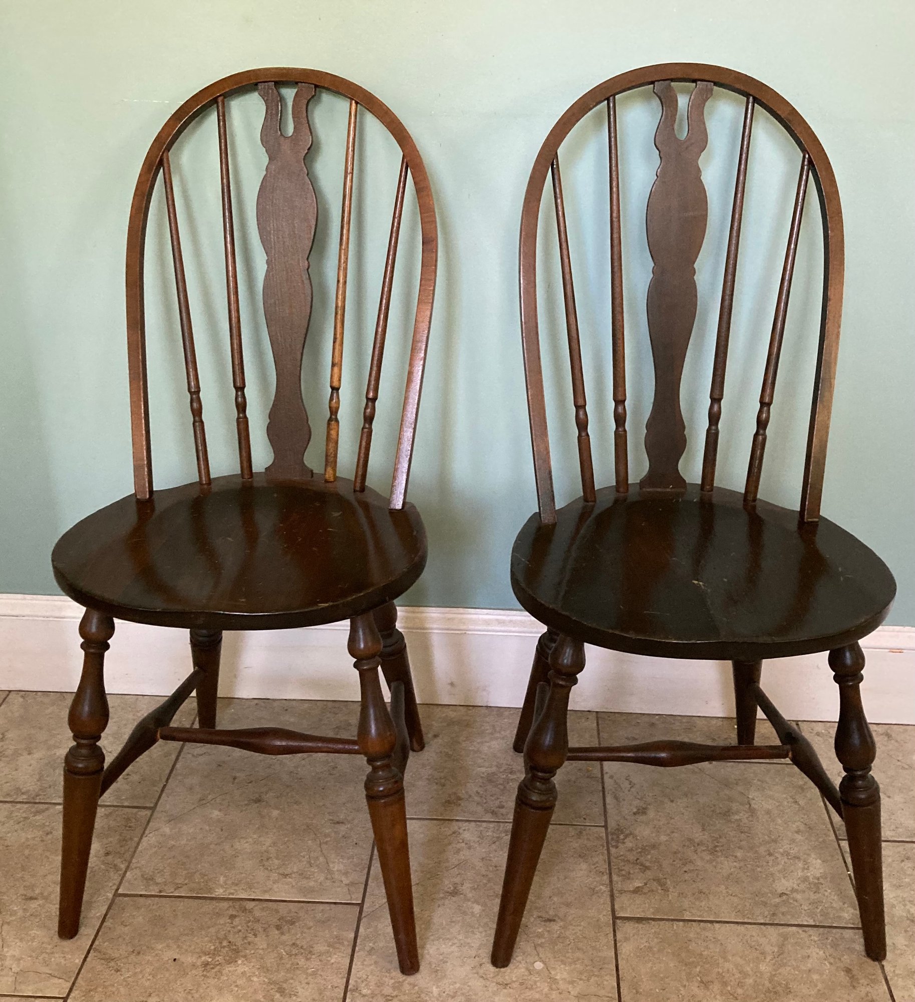 2 vintage Windsor chairs. One needs some regluing in the cross bars on the bottom but otherwise in good condition.