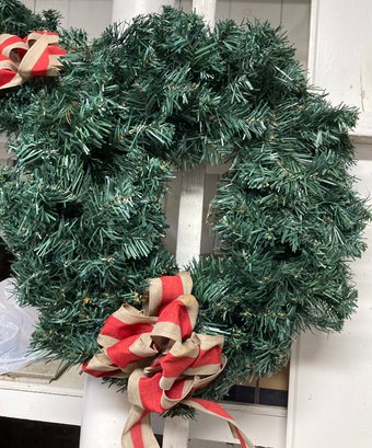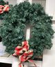 6 good condition and full holiday wreaths. 10" round. Were used on the 6 outside windows. The bows on them are red and burlap and are wired ribbon so they can be poofed to your taste or retied in a different bow.