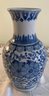 Imported by Two's Company, this beautiful blue and white vase is of classic design. The vase stands 12" high and is about 6.5" wide. There are no chips or cracks.