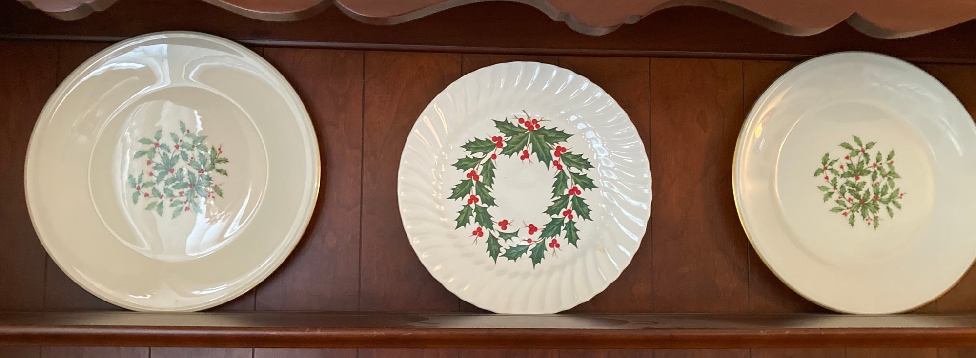 2 Lenox and one generic holly holiday serving plates. The Lenox plates measure 11" round and the generic one is 10" round. All are in excellent condition with no chips or cracks.