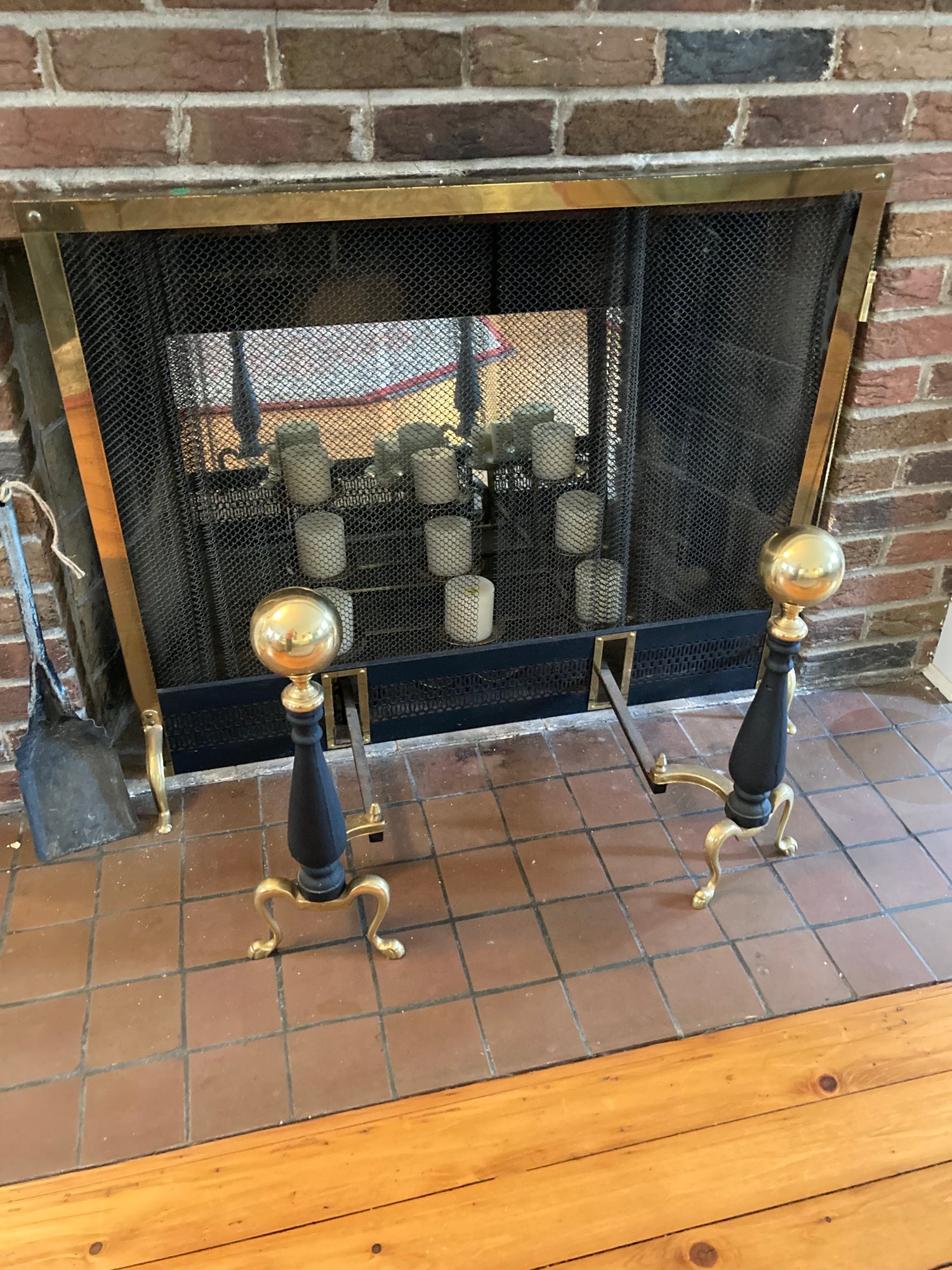 Vintage standalone mesh screen that opens with a brass chain. The screen measures 38" wide and stands 31" tall. The andirons are 20" high with 18" legs. The candle stand is 21" wide by 15"d by 9.5" high. It includes all 9 candles which are not used.