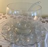 Unusual round 60's era punch bowl. The punch bowl measures 11" wide and 10" high. There are 12 cups to match with one handle broken and one with a small chip. There is also a glass ladle for serving. The bowl rests on a pressed glass tray that didn't come with the bowl but fits all the items nicely. The tray measures 17" round. This is great for seasonal display or to make your favorite drink and to serve with style.