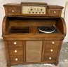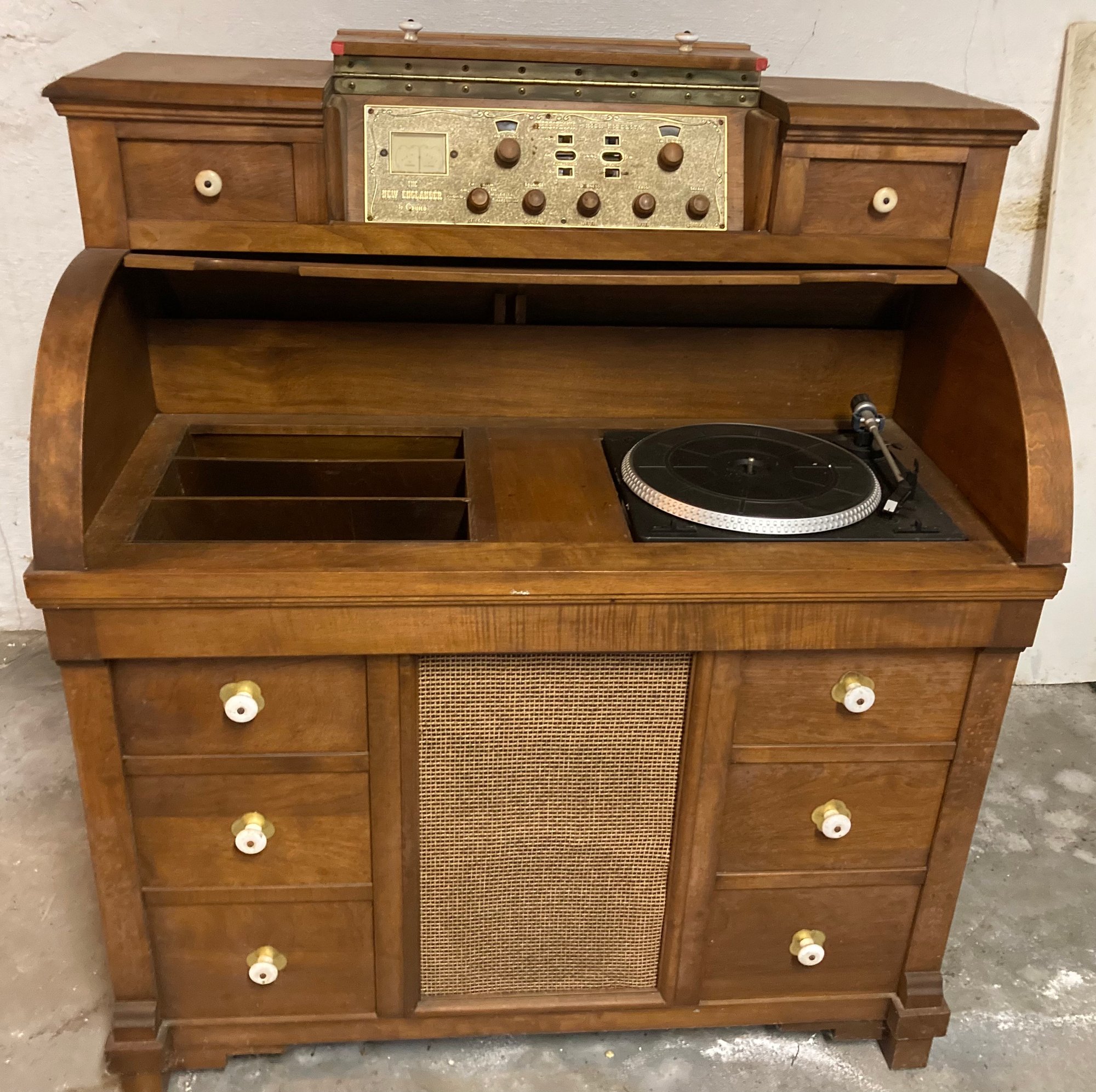 The New Englander by Guild vintage record player and radio. Untested radio/record player from the 60's. Colonial design. There are 3 speakers, one in the front and one on each side, controlled by opening and closing the doors. It plays several different speeds and has the spool to also play 45's. Inside the cabinet is room to store your albums next to the turntable. The radio is AM/FM. The front right trim has separated from the base but otherwise in good condition.