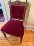 Lovely red velvet tufted back chair. All upholstery is in very good condition. The front legs have the original wheels. The wood spoon carving is in excellent condition.