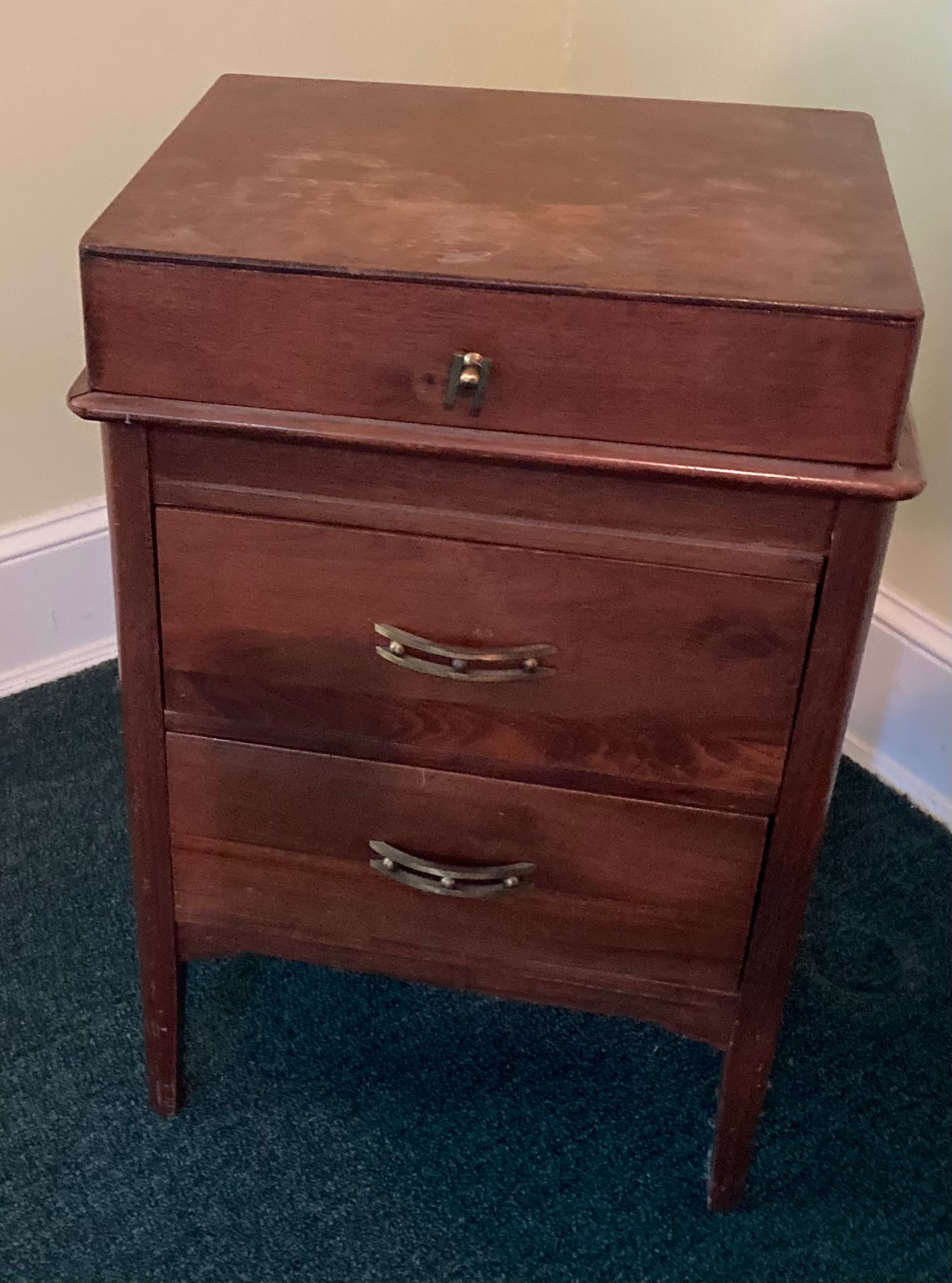 Vintage condition sewing supply cabinet. Has trays for thread and notions and 2 drawers for all your sewing needs.