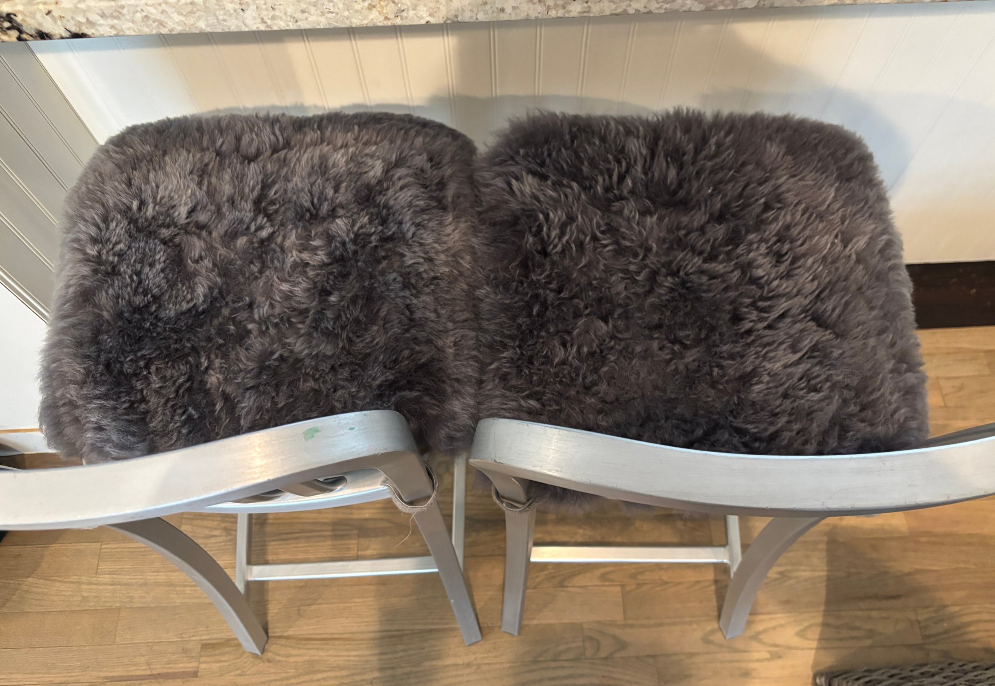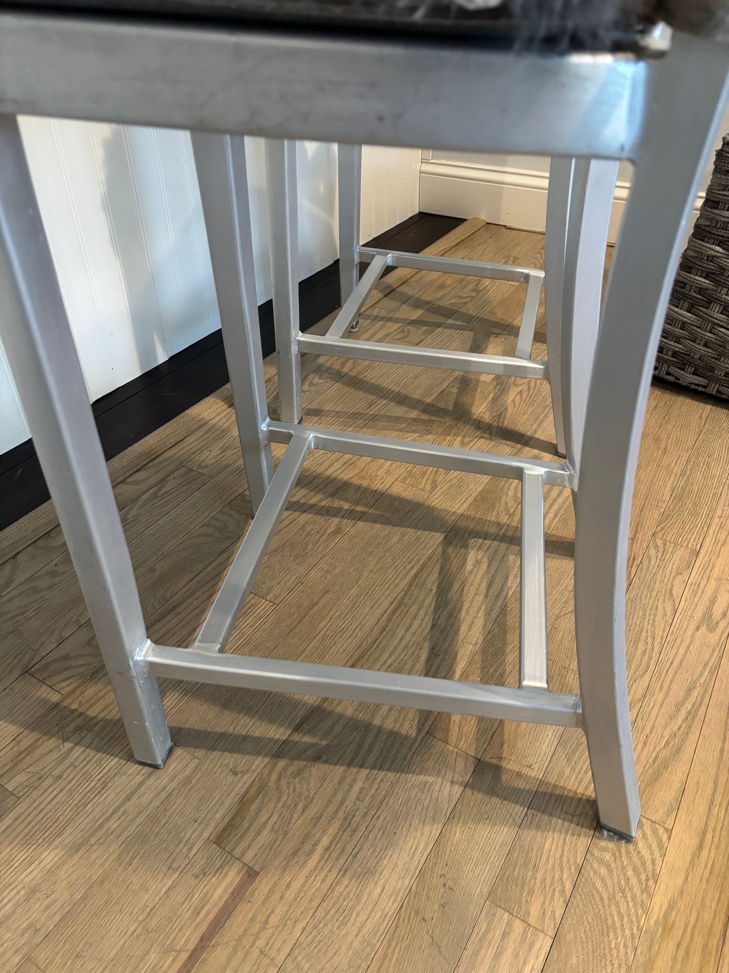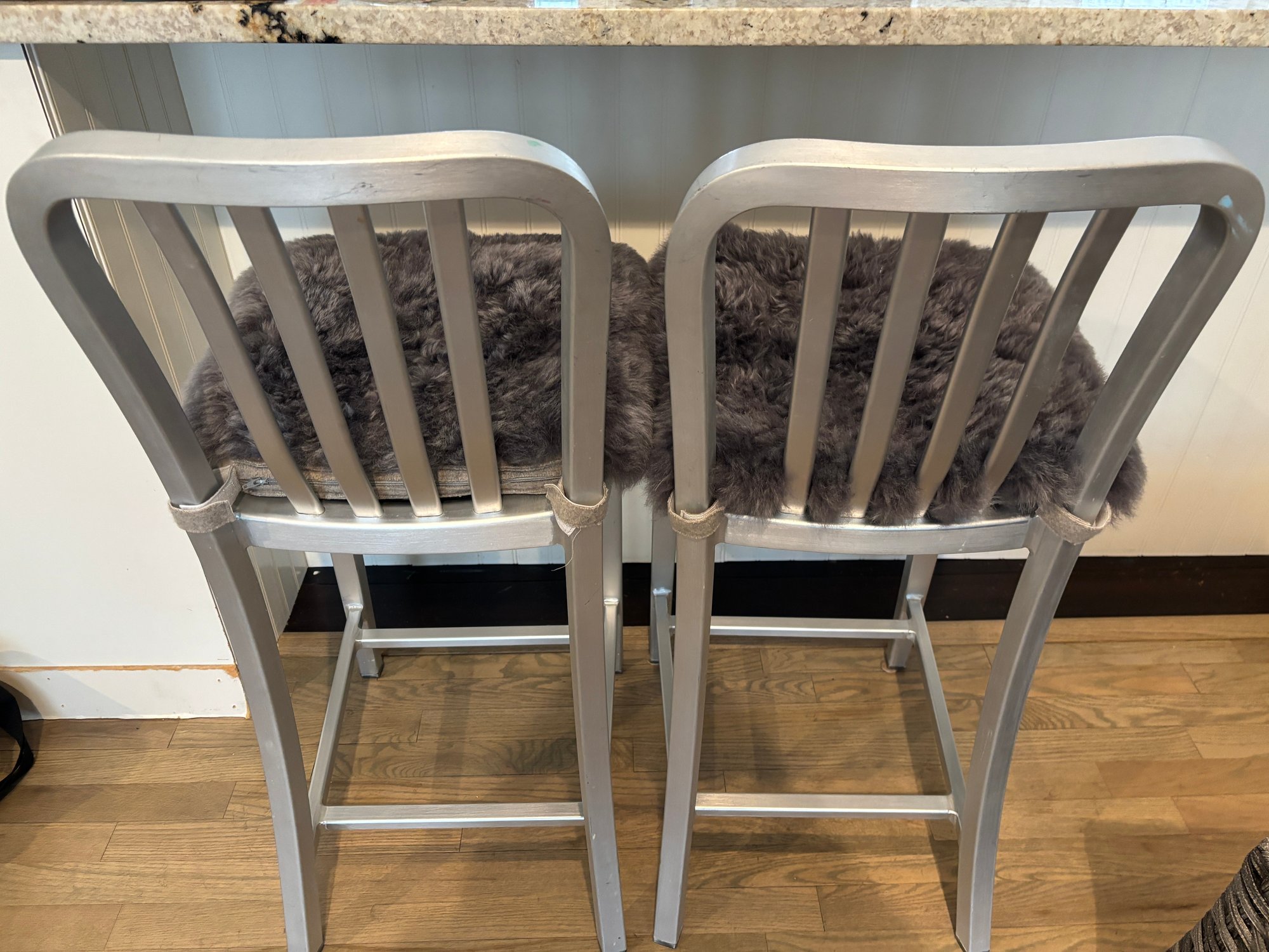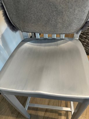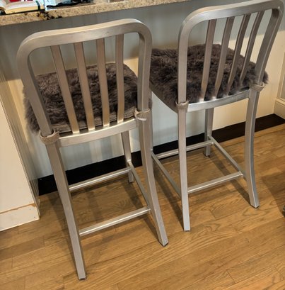Two Crate & Barrel Delta Aluminum Counter Stools featuring a hand-polished anodized aluminum frame and a plush grey cushion.