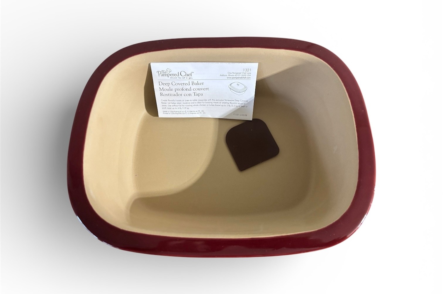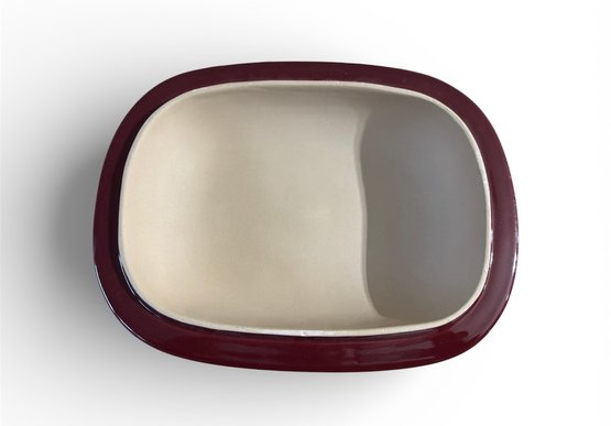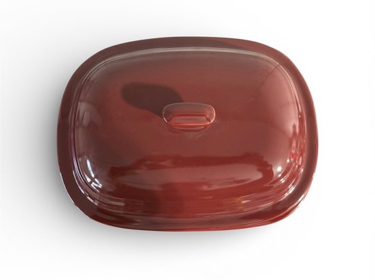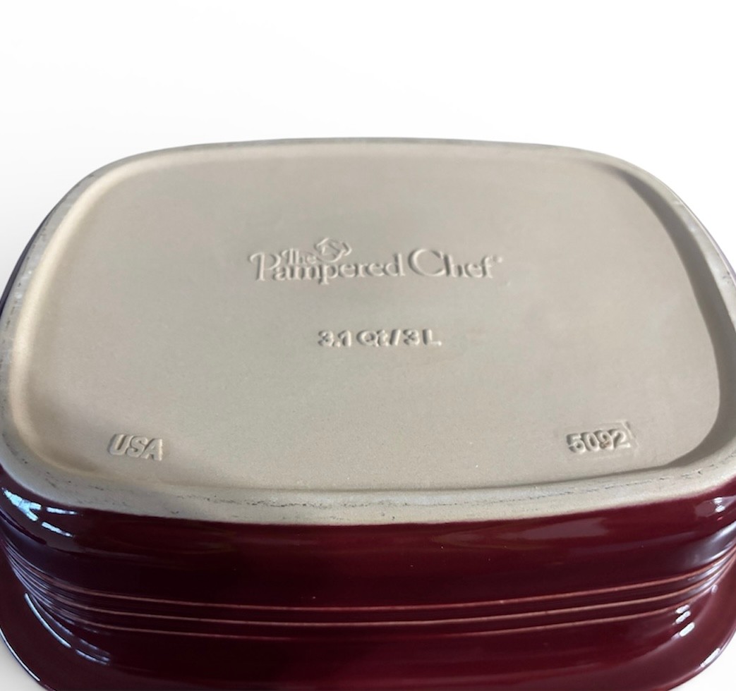 Brand new Pampered Chef Deep Covered Baker (Model 1321) in the Cranberry color. Versatile stoneware dish designed for roasting, baking, and making casseroles in both conventional ovens and microwaves.