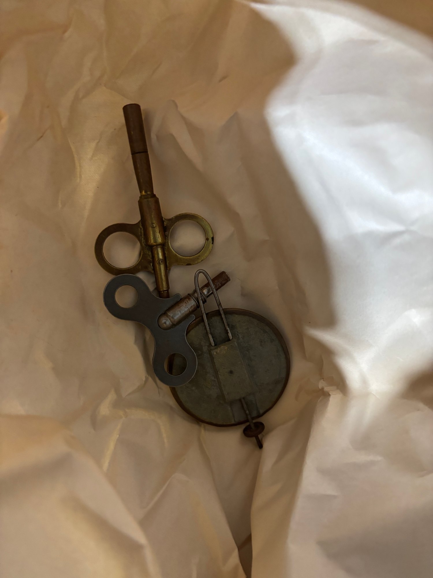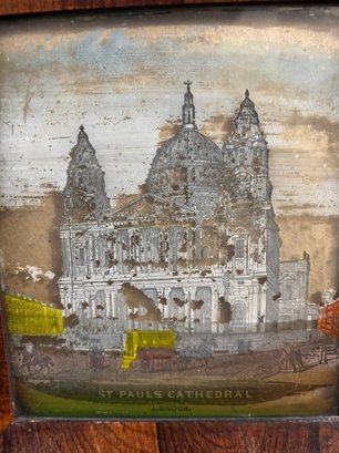 A reverse-painted tablet is on the lower door, depicting scenes of St. Paul's Cathedral.
