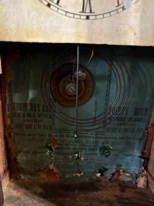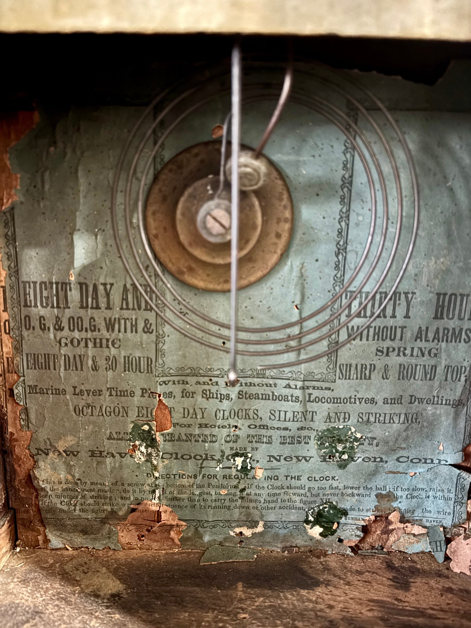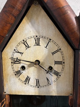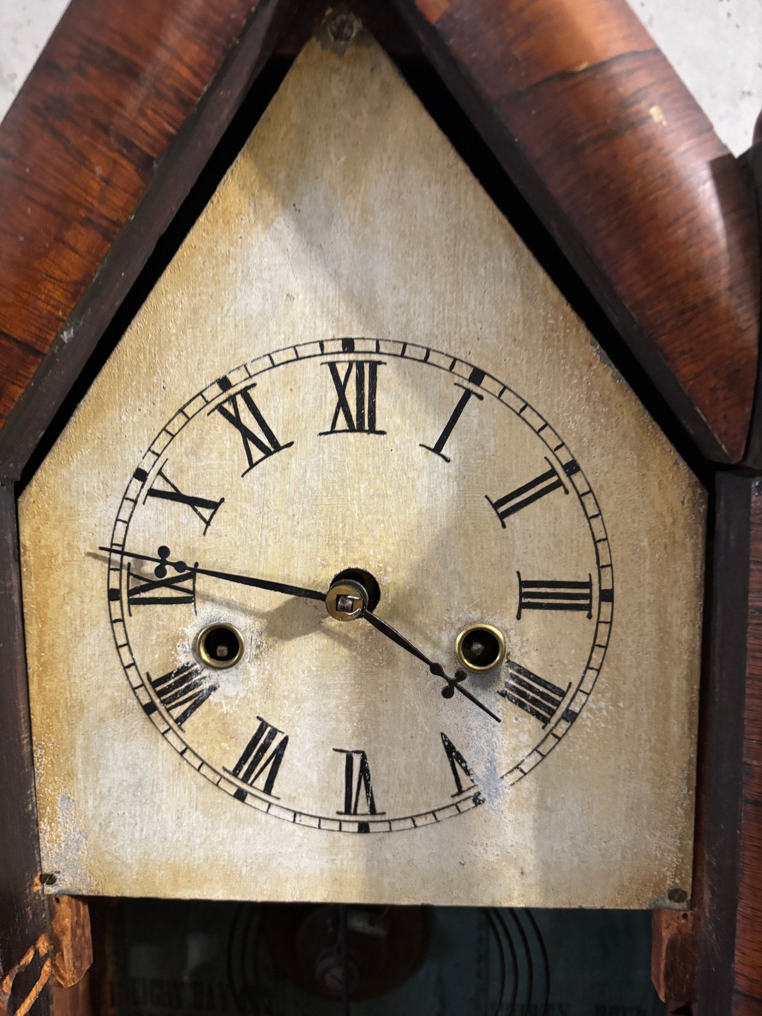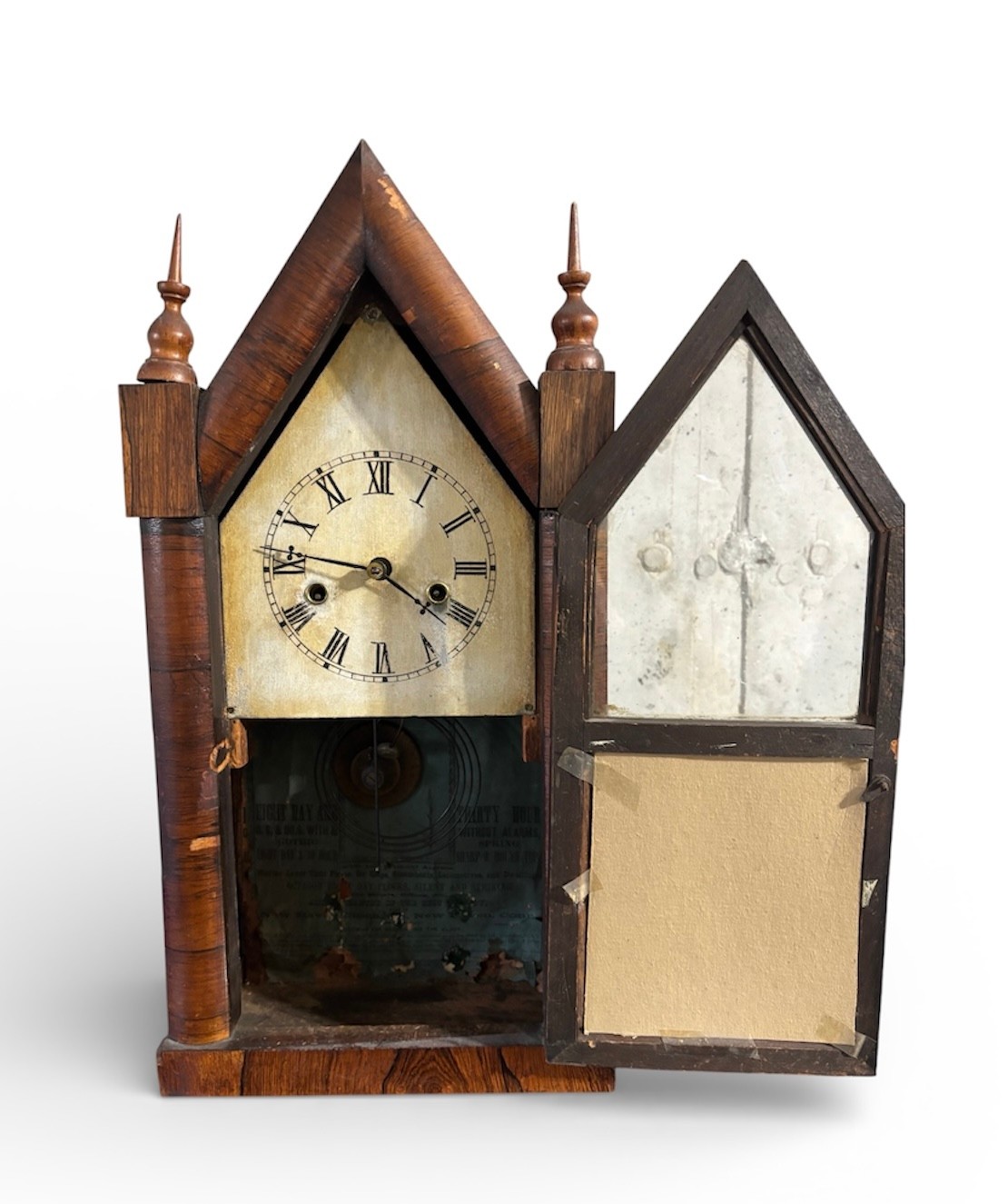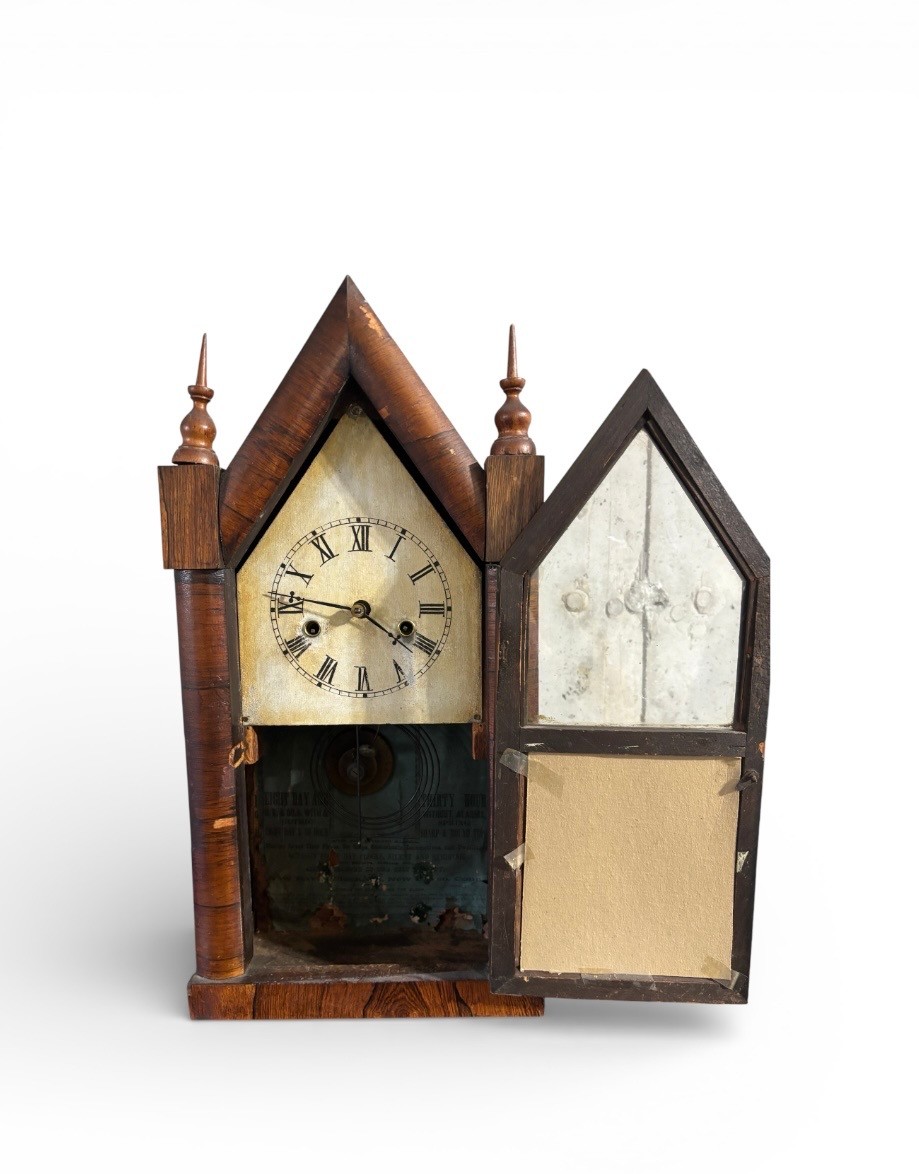 Antique Chauncey Jerome mantel clock, a steeple-form Gothic Revival design.