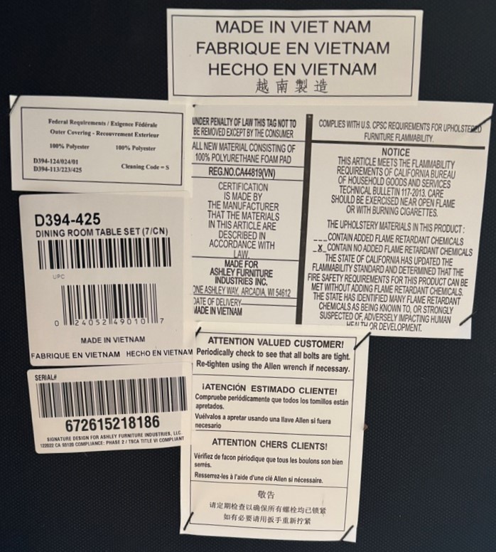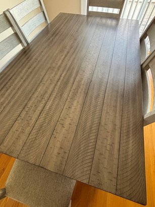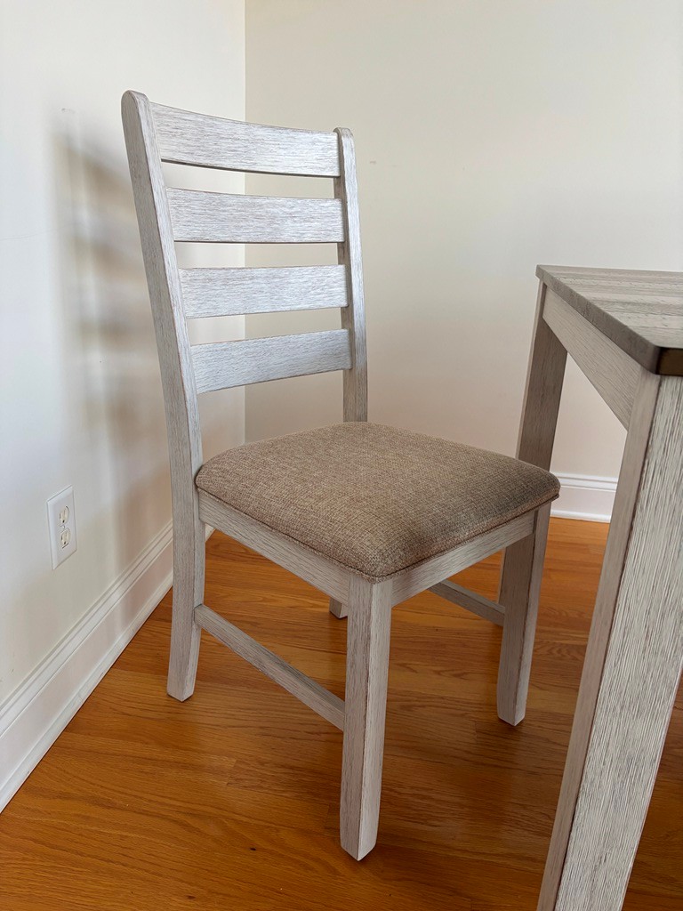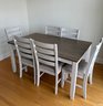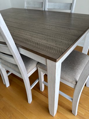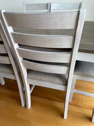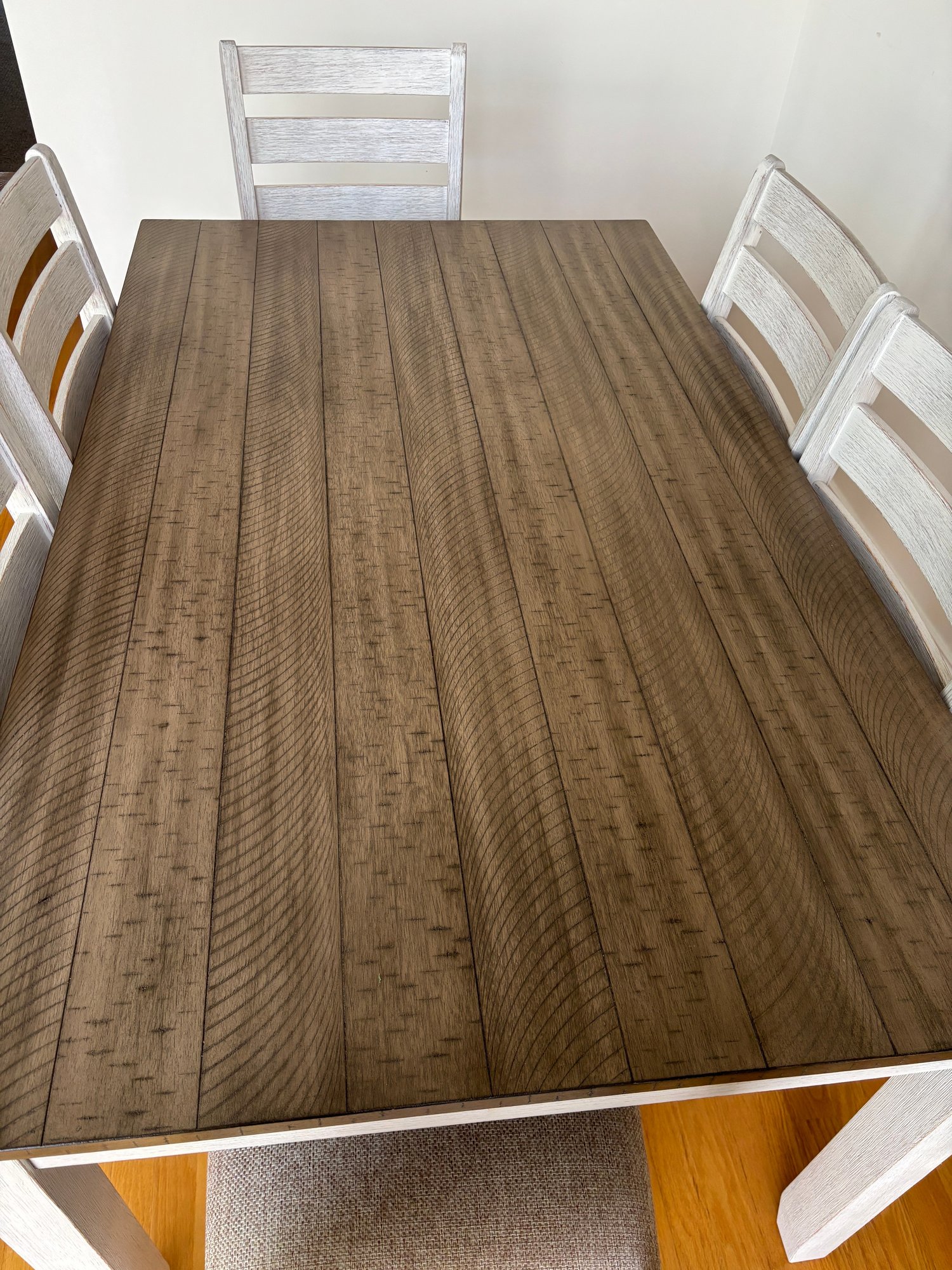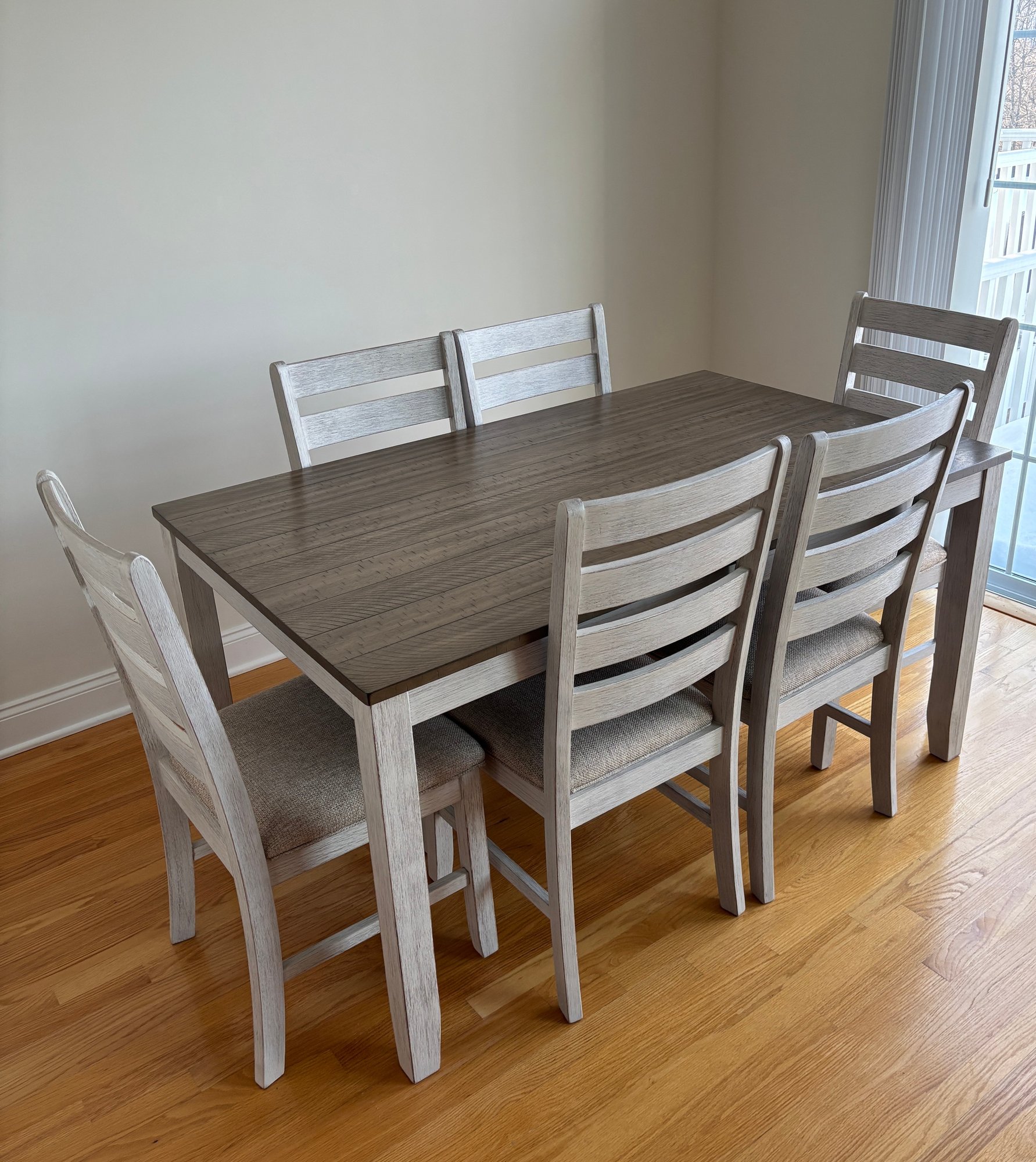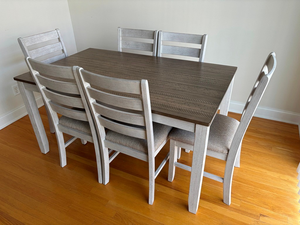Ashley Skempton Dining Table with 6 Chairs, New. Solid wood, engineered wood and acacia veneers. Two-tone finish. Original price $799.99.