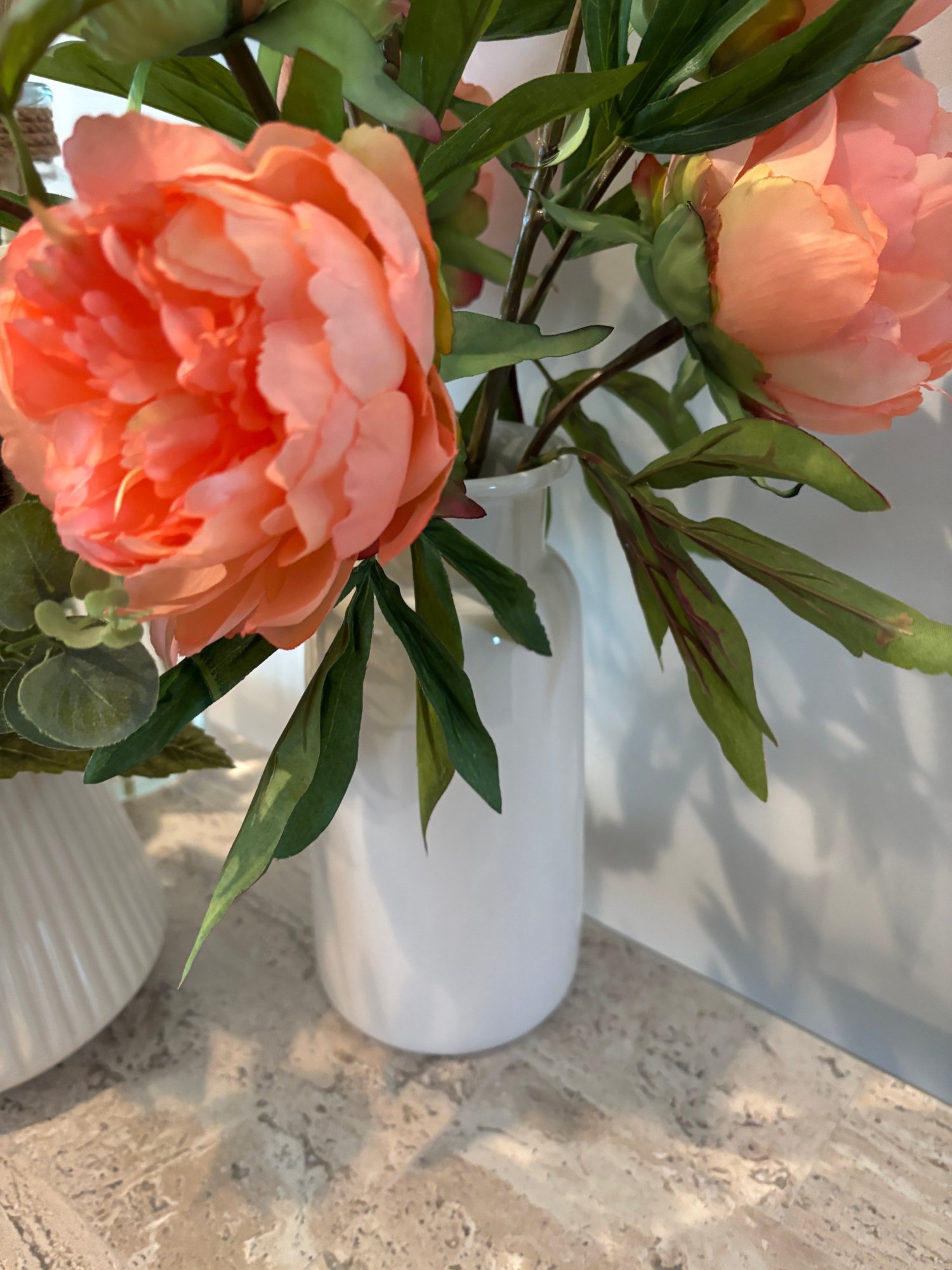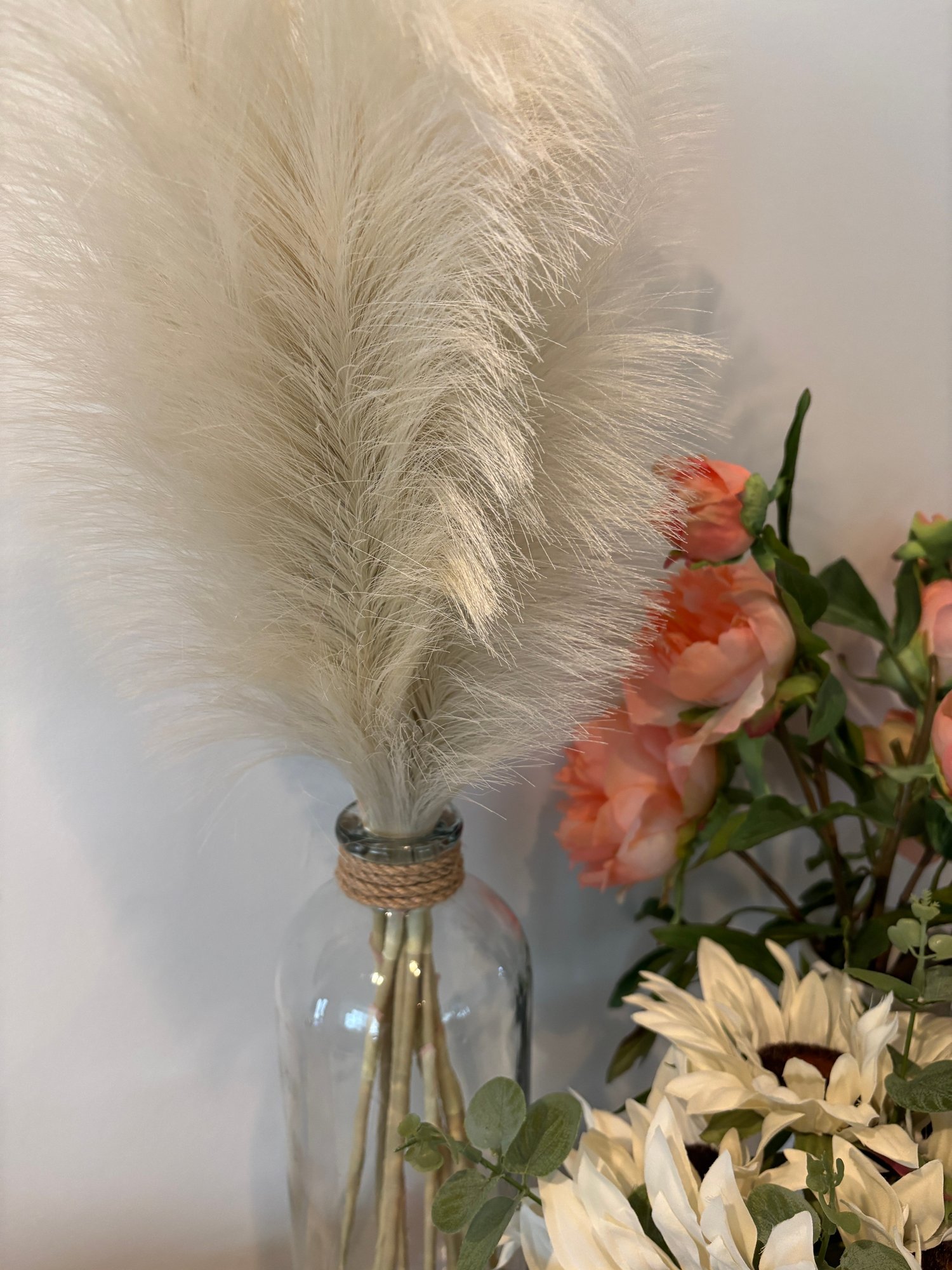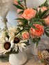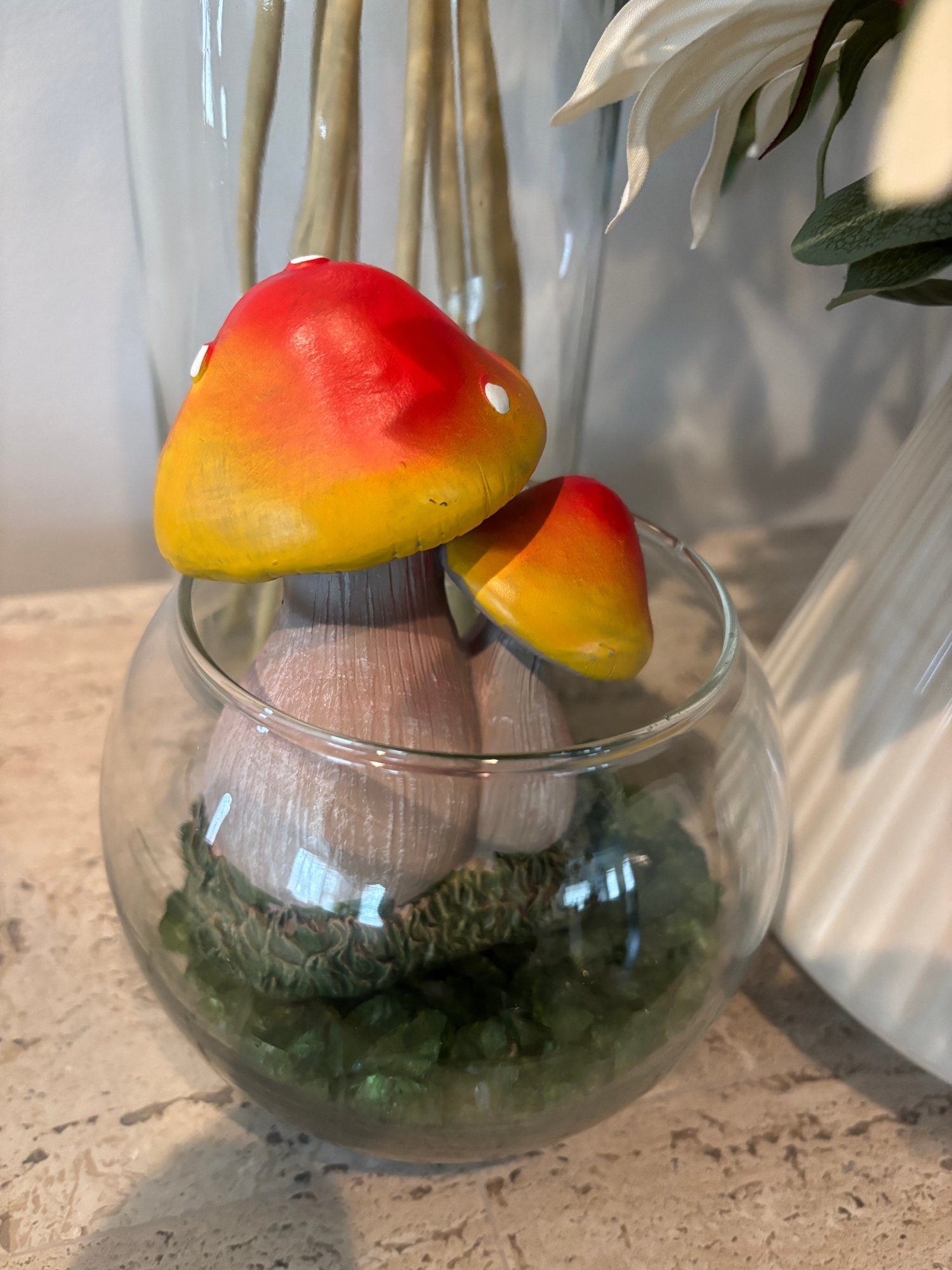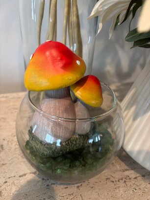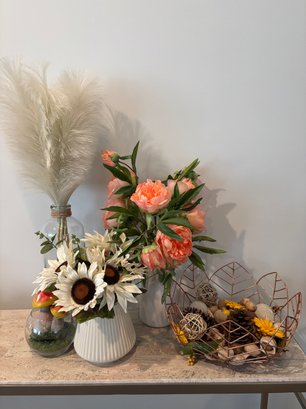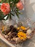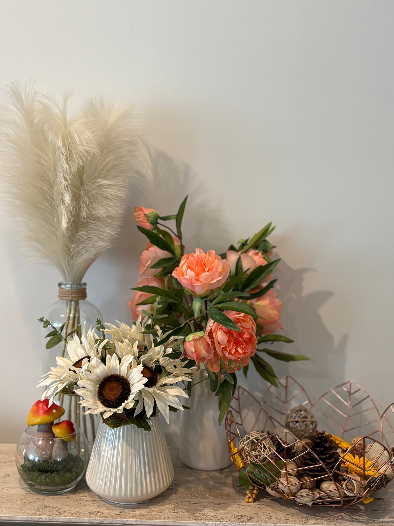 Faux flowers, gathering basket, vases, mushrooms