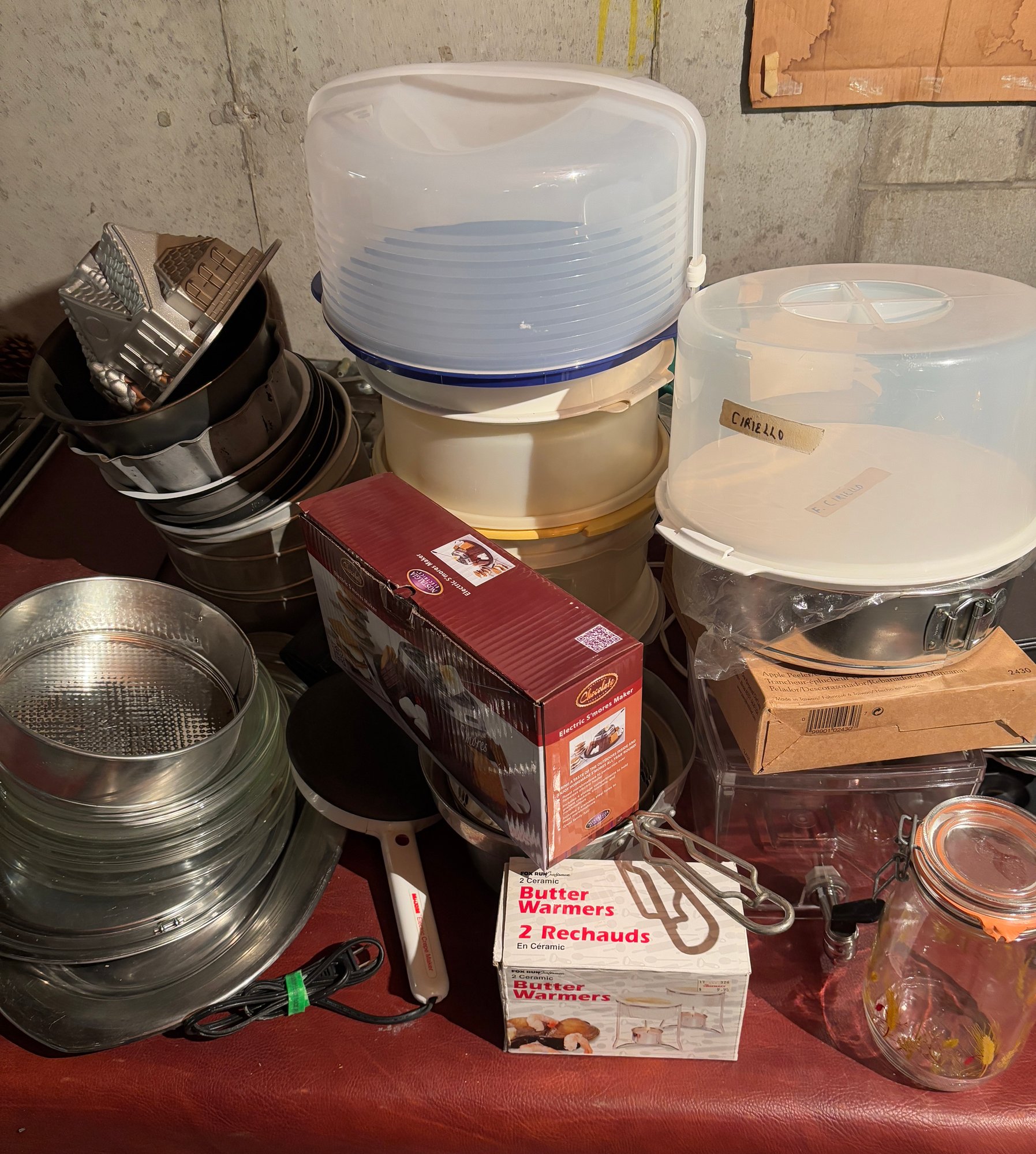 So many baking items! Cake transport containers, molds, muffin tins, butter warmers, sifters, bundt pan, electric smores maker, baking pans and more. Bring a few large boxes if you win this lot!