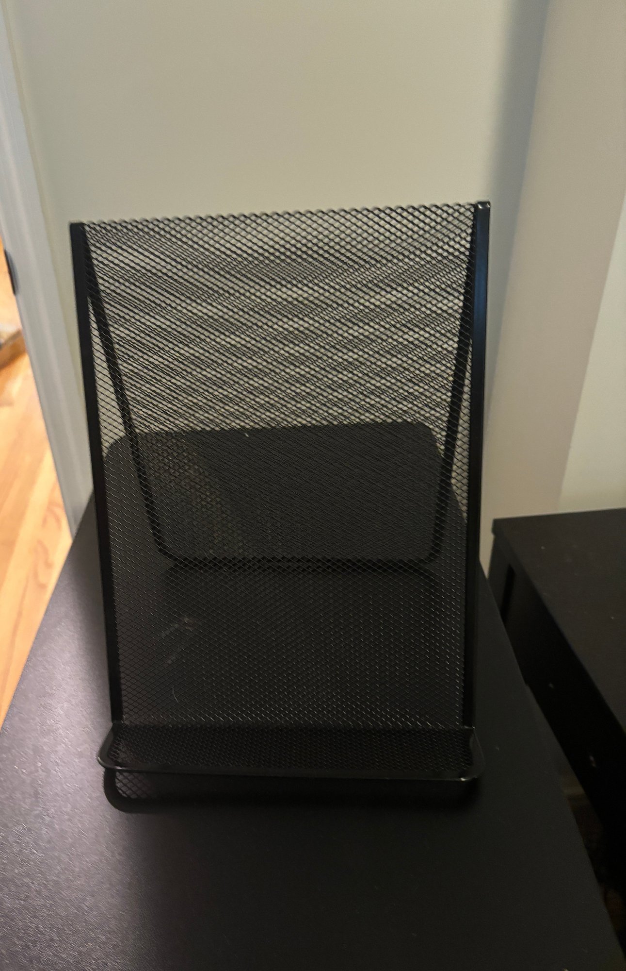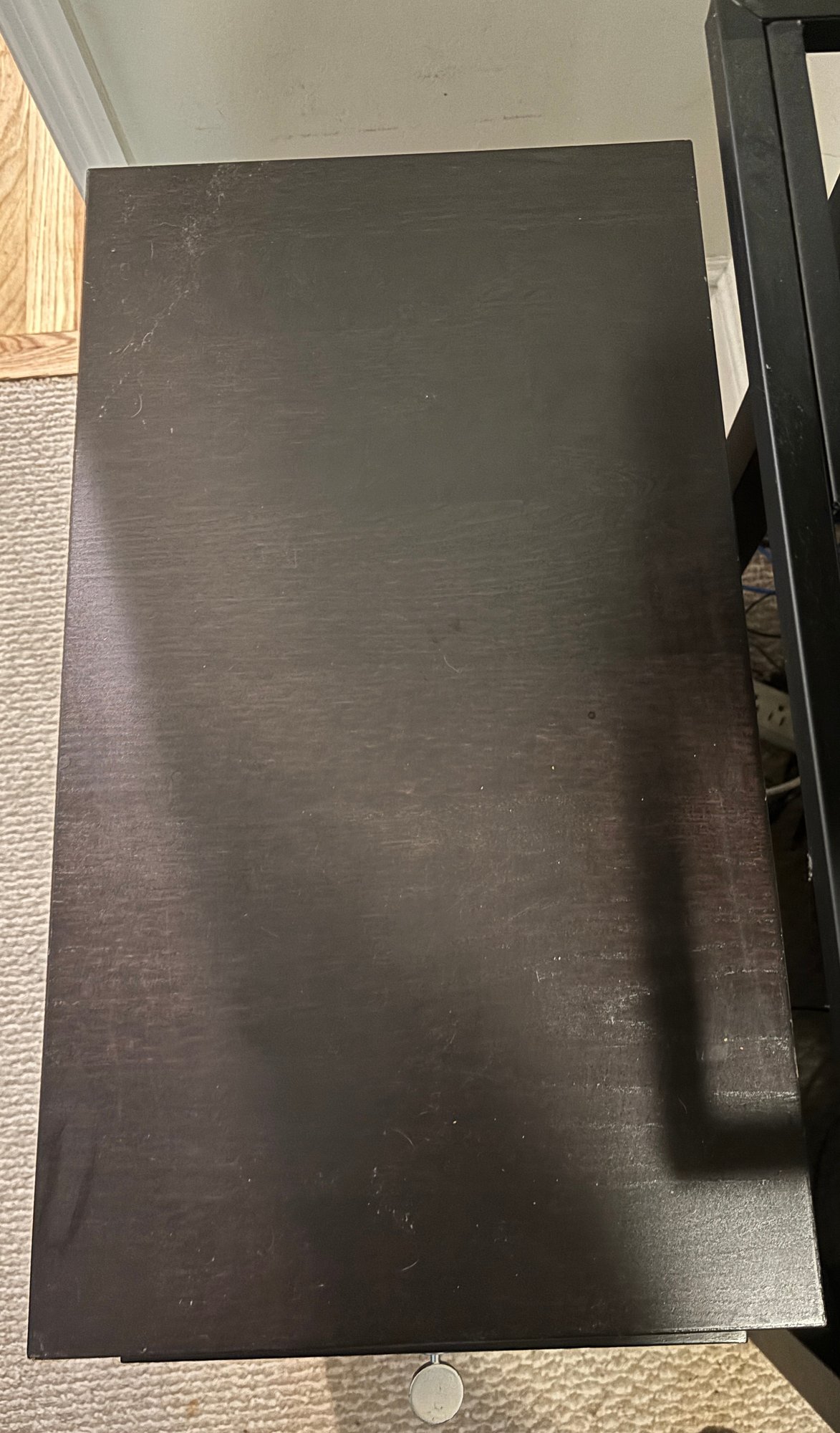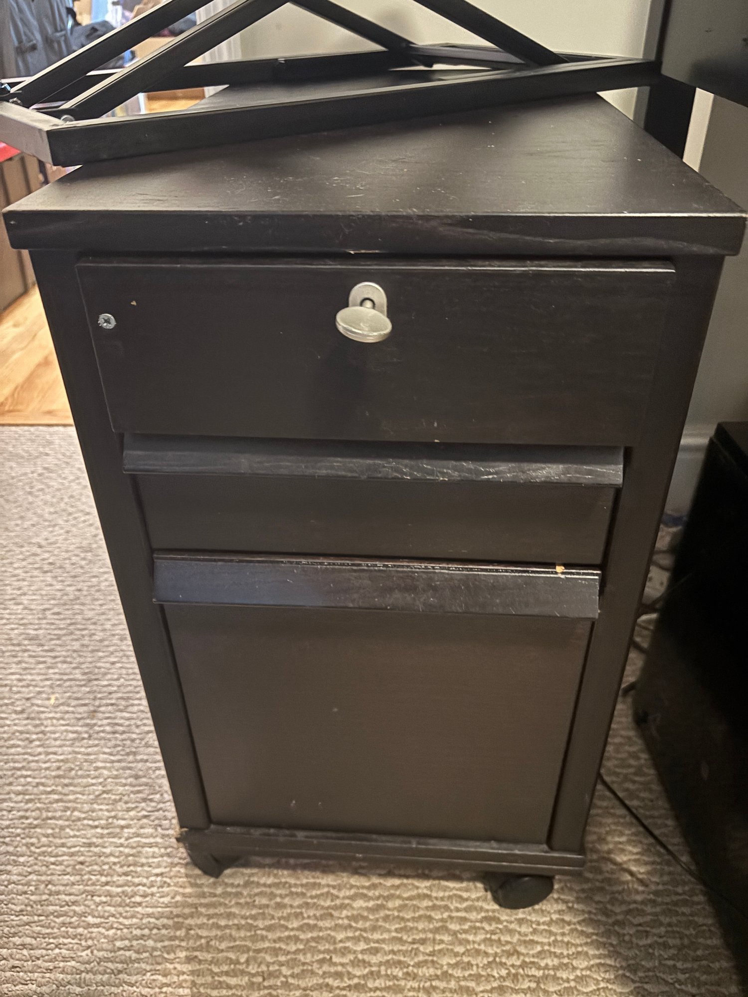 Three drawer black file cabinet made of sturdy wood.