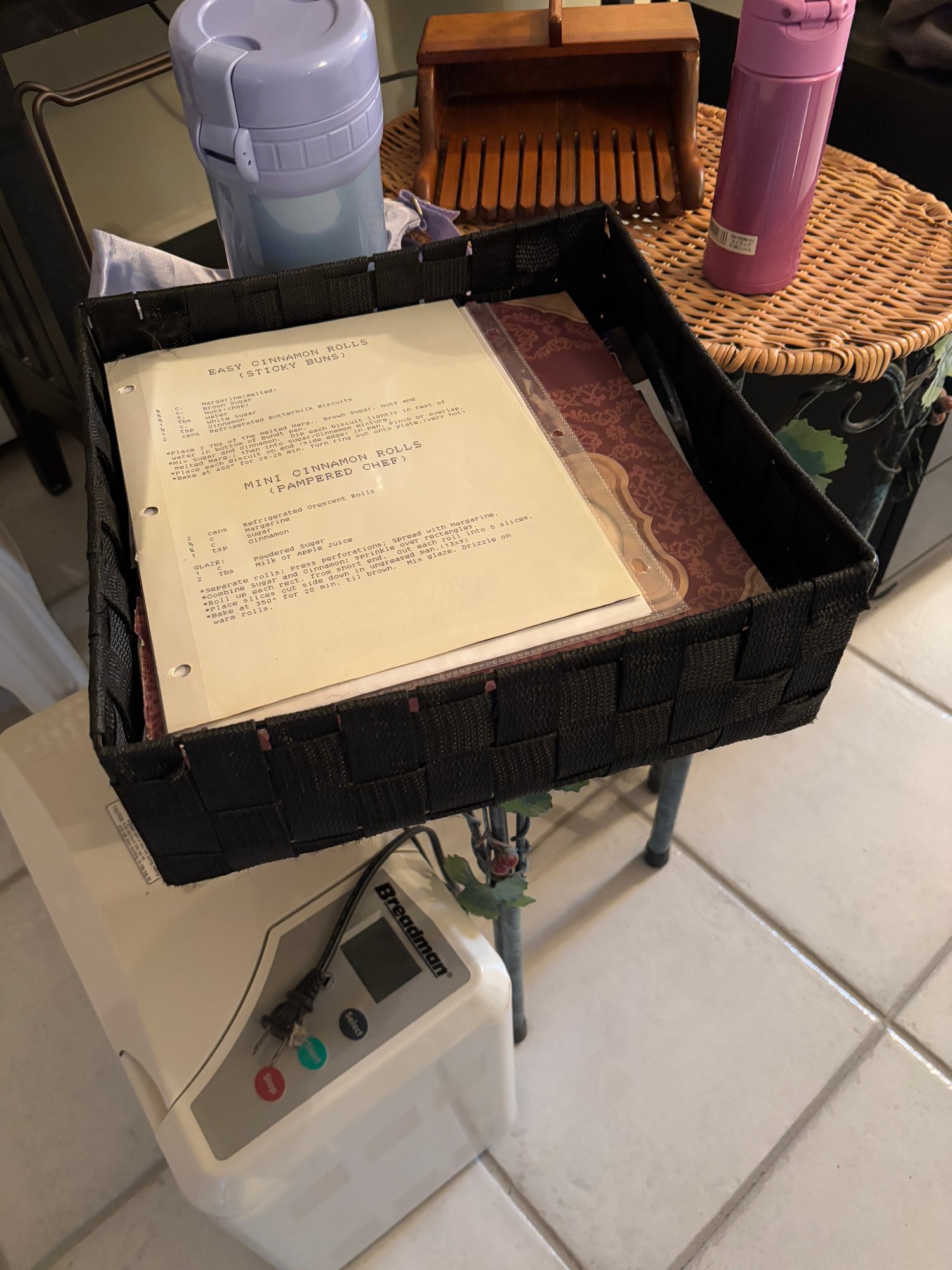 Breadman bread machine, two small rattan/wicker tables and a stash of recipes from a great cook/baker.