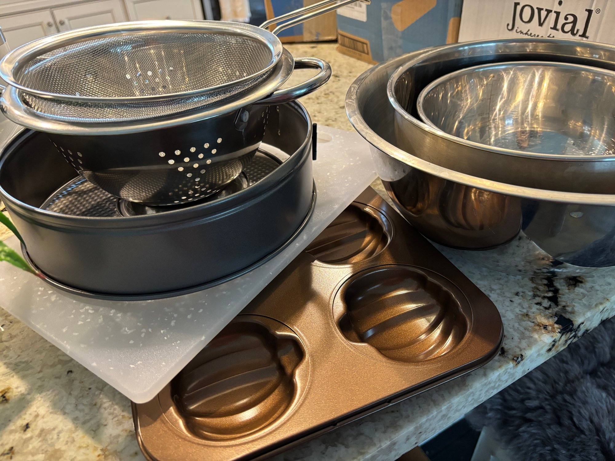 Cutting boards, bundt pan, strainer, bowls, pumpkin mold.