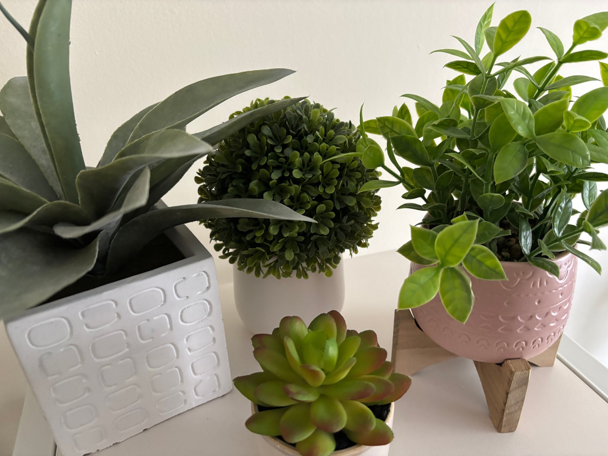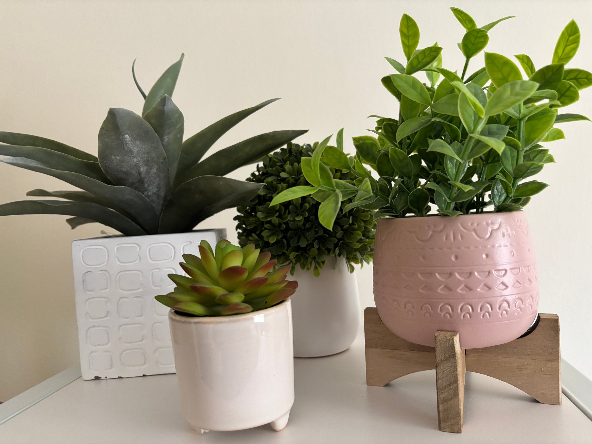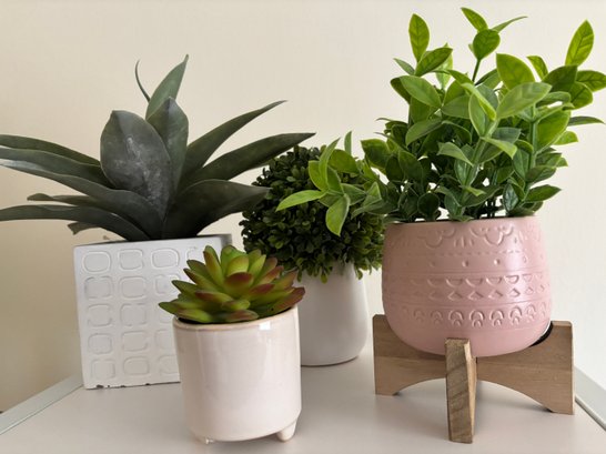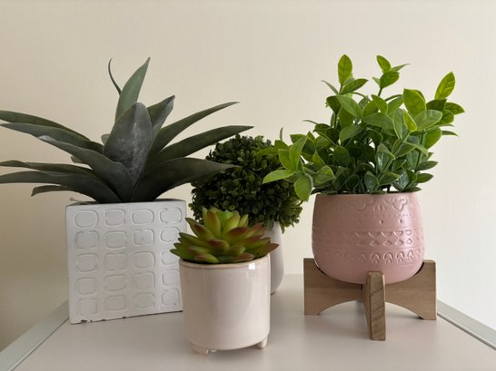 Set of faux plants in various textured ceramic pots and a wooden stand