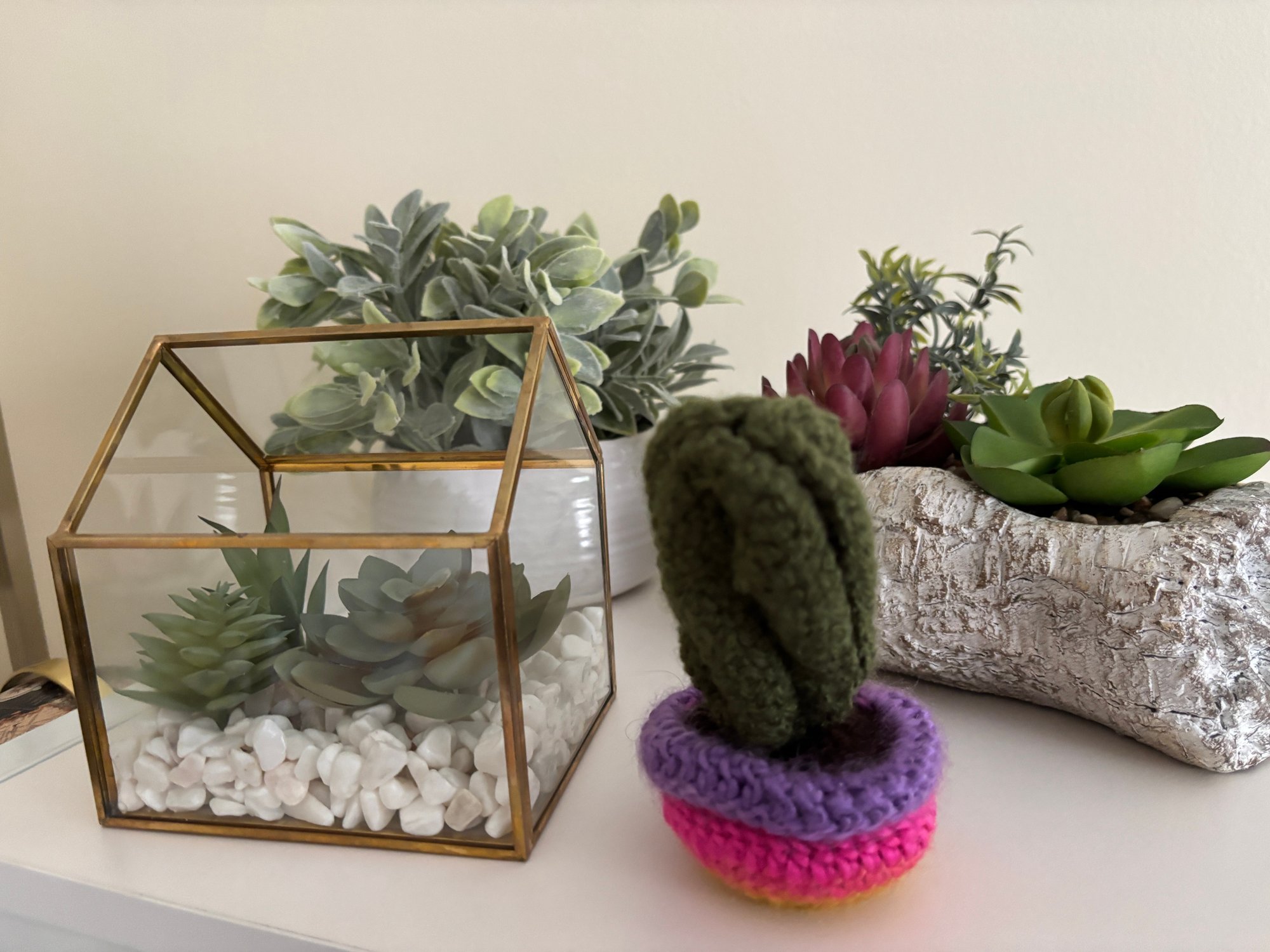 Also includes stone/faux stone planters and a knitted (crochet?)cactus.