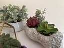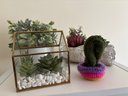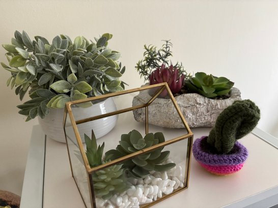 An assortment of faux plants in different materials, including a geometric glass terrarium, which is a decorative planter box often used for succulents and cacti.