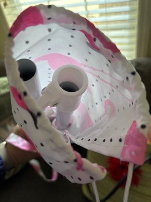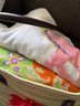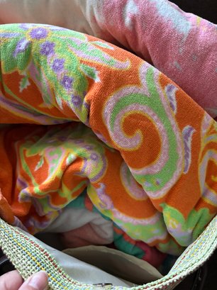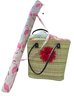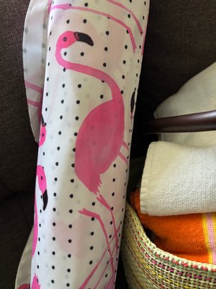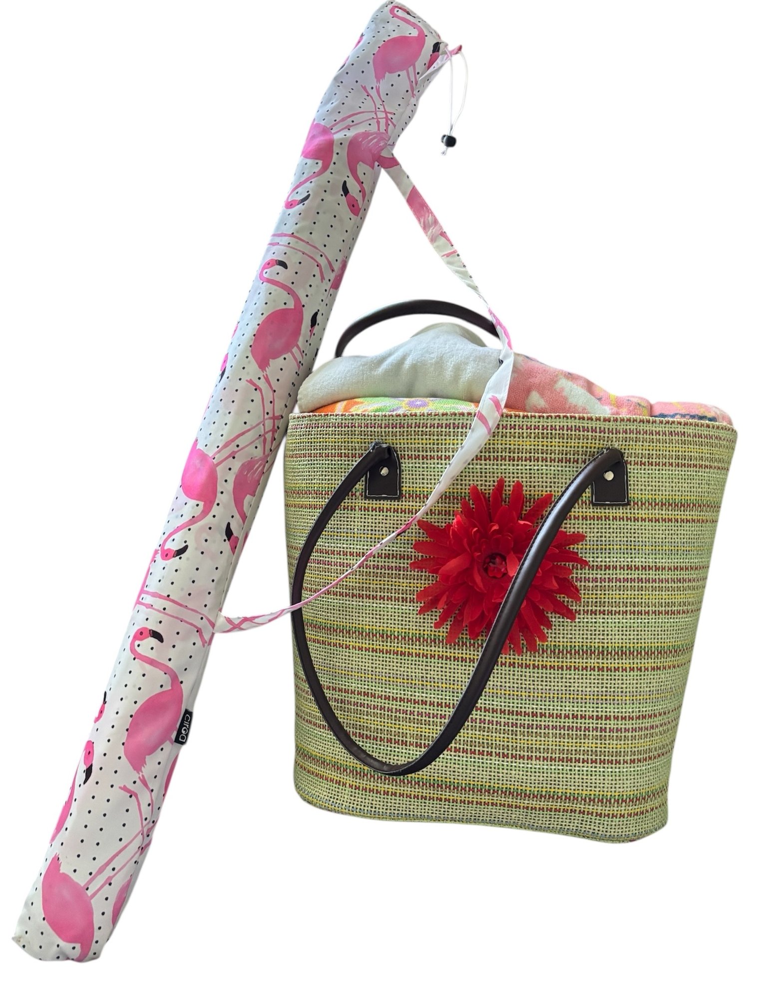 Woven beach tote bag paired with a matching flamingo-patterned umbrella carrying bag and assorted beach towels.