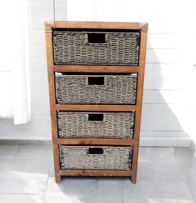 This versatile closed wood table houses 4 rattan shelving baskets. Perfect for a nightstand, end table or anywhere table.