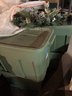 4 totes of Christmas decorations and a faux greenery centerpiece.