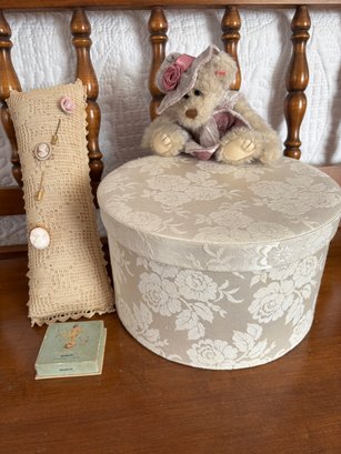 Lot also includes stickpins/hatpins, stuffed bear and vintage Woodbury makeup.