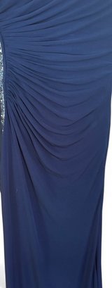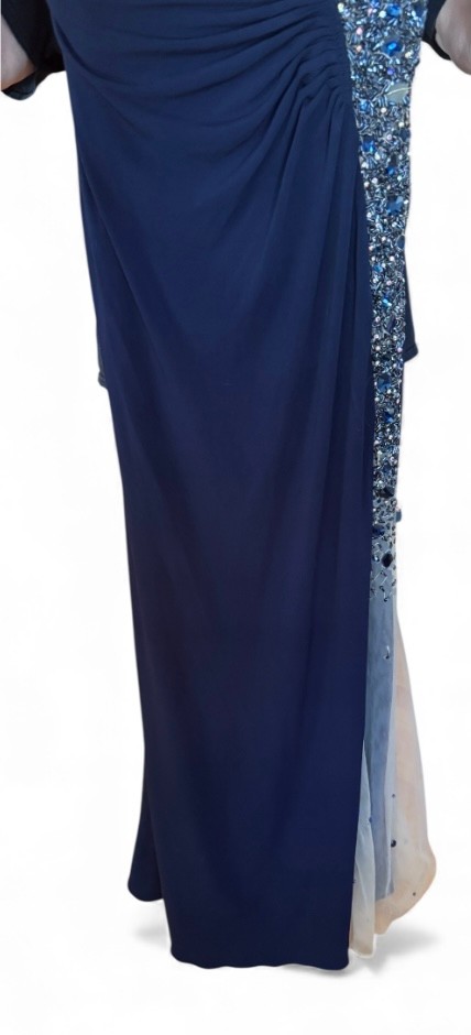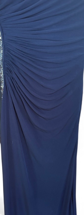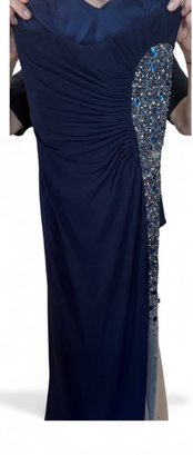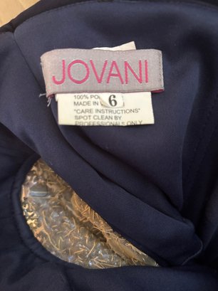 This beautiful evening dress is suitable for any dressy event - including wedding, prom or holiday party. You could even re-make this into another piece of apparel. This beautiful deep blue Jovani dress sparkles. Size 6 (although it was likely altered).
