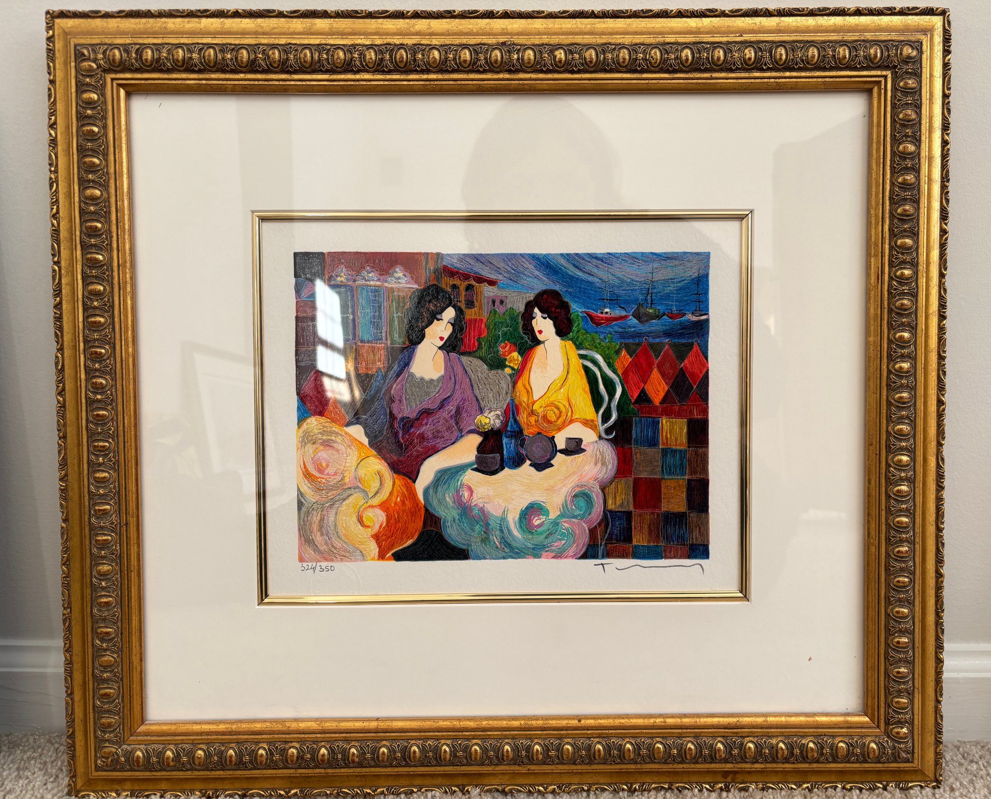 The image is a limited edition serigraph by Itzchak Tarkay, an Israeli artist. It is numbered 324/350, indicating it is the 324th print out of 350. Key details include: