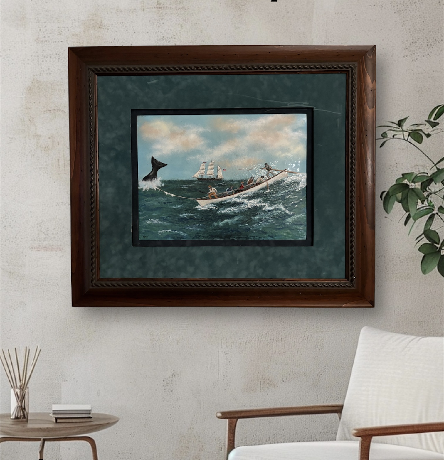 John Shaw (Nantucket 1935-2017) Enamel on Copper a whaling scene depicting whalemen in a longboat going on a whale hunt, signed lower left Shaw.