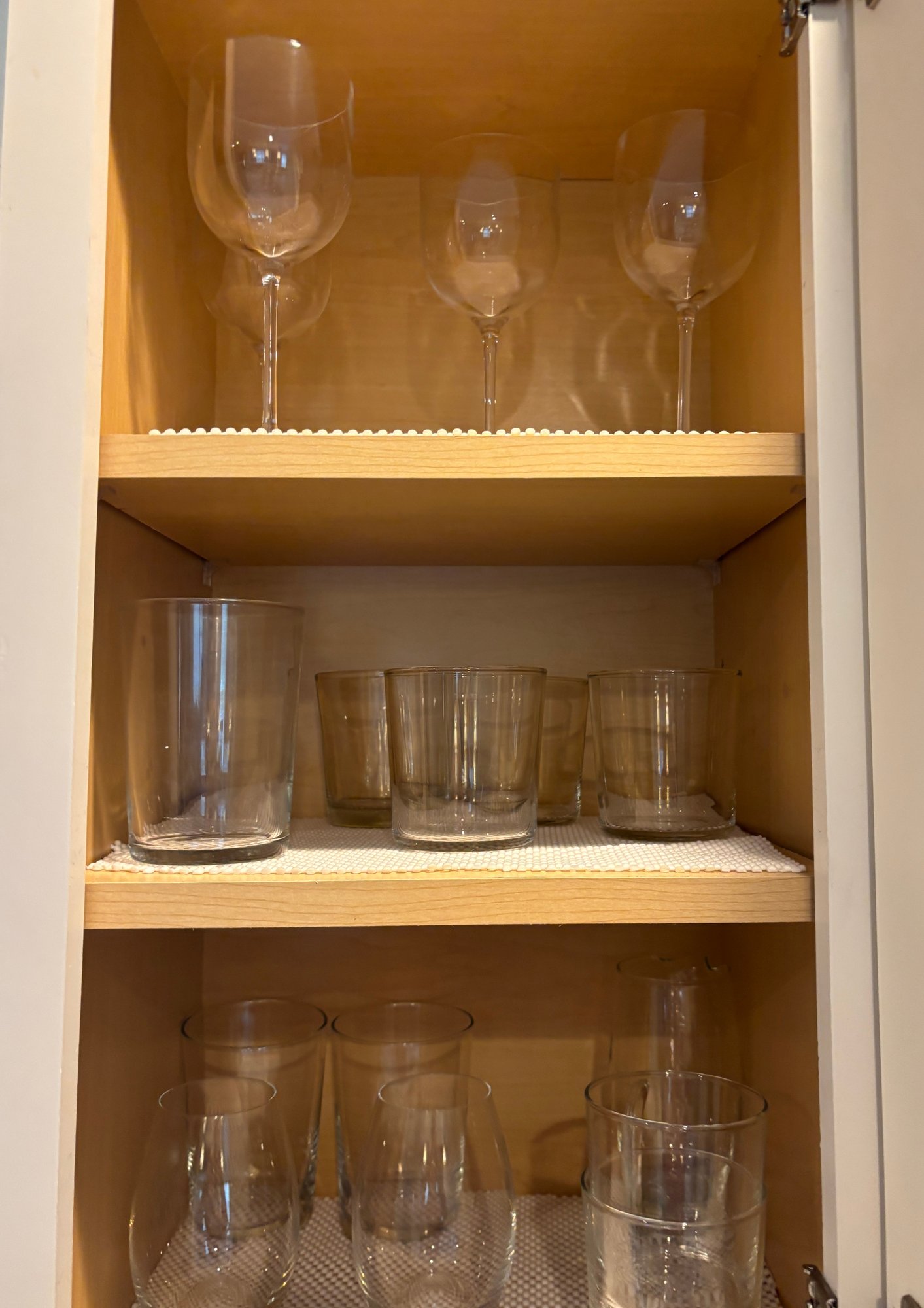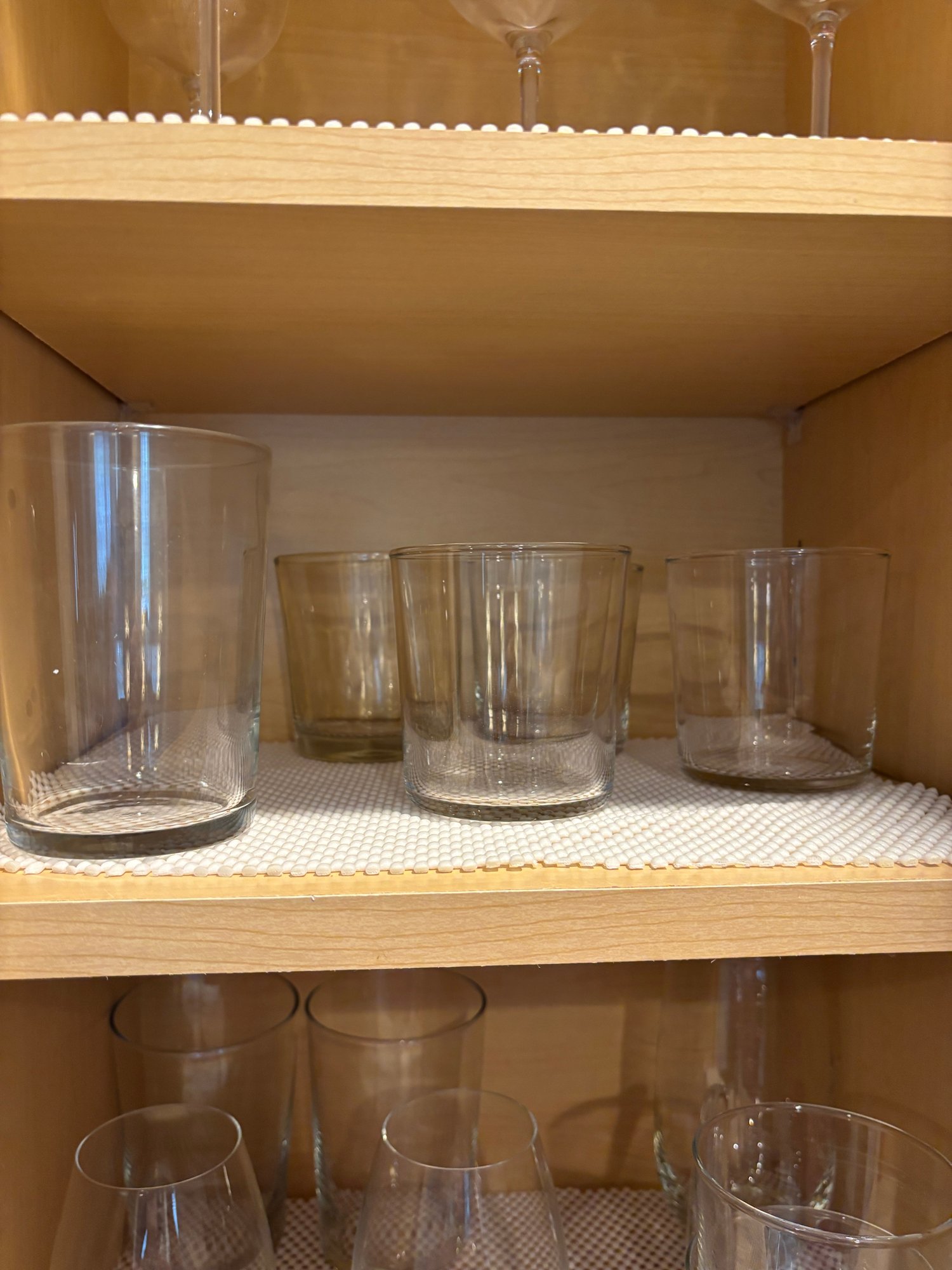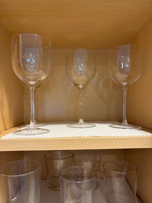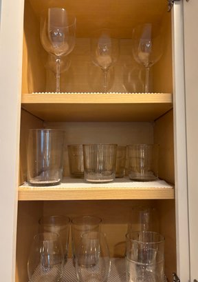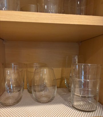 Assorted well made glassware including stemless wine glasses tumblers, drinking glasses and more.