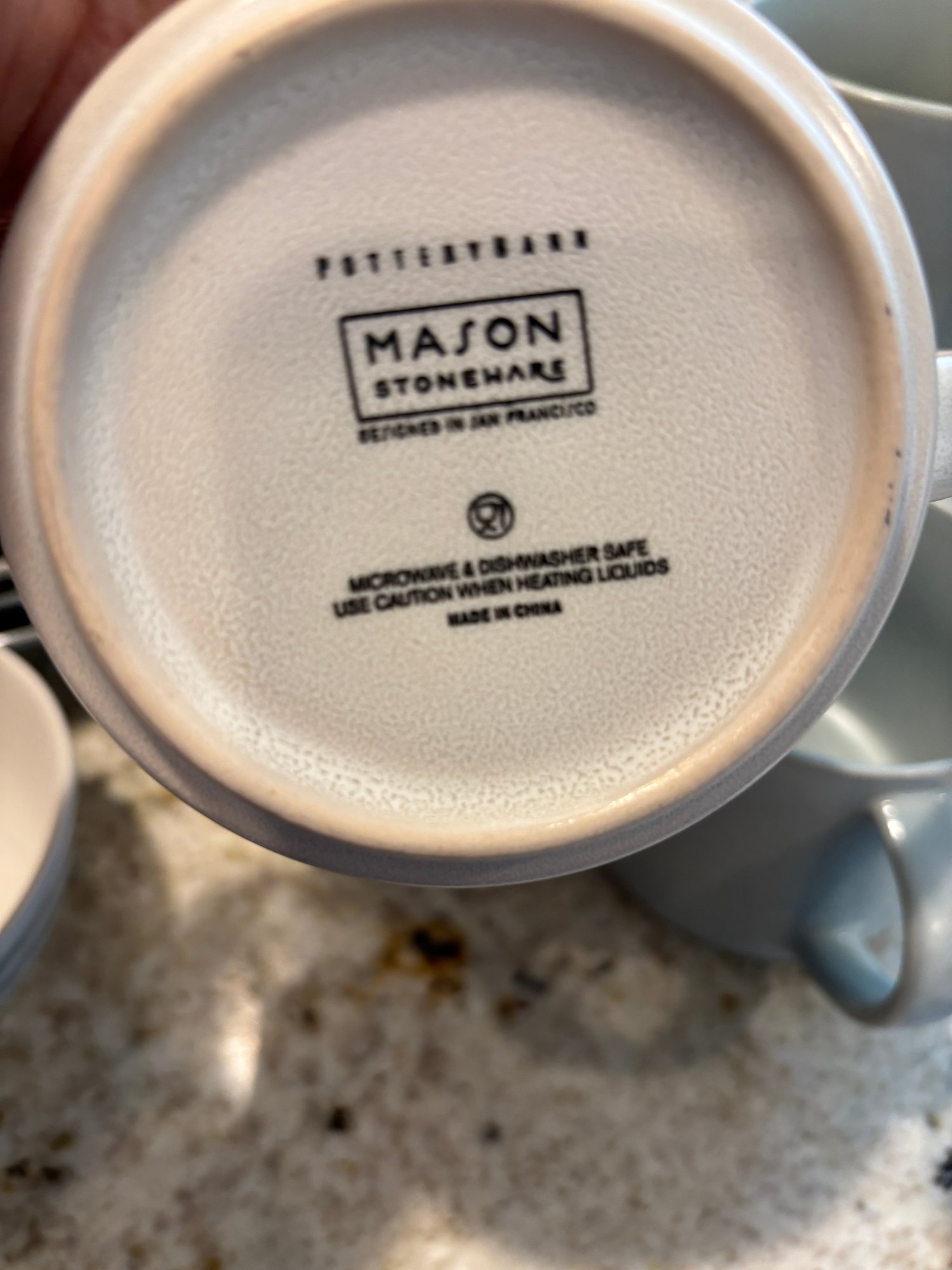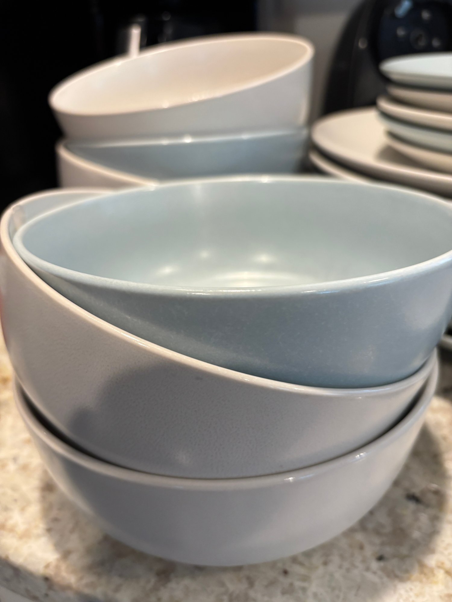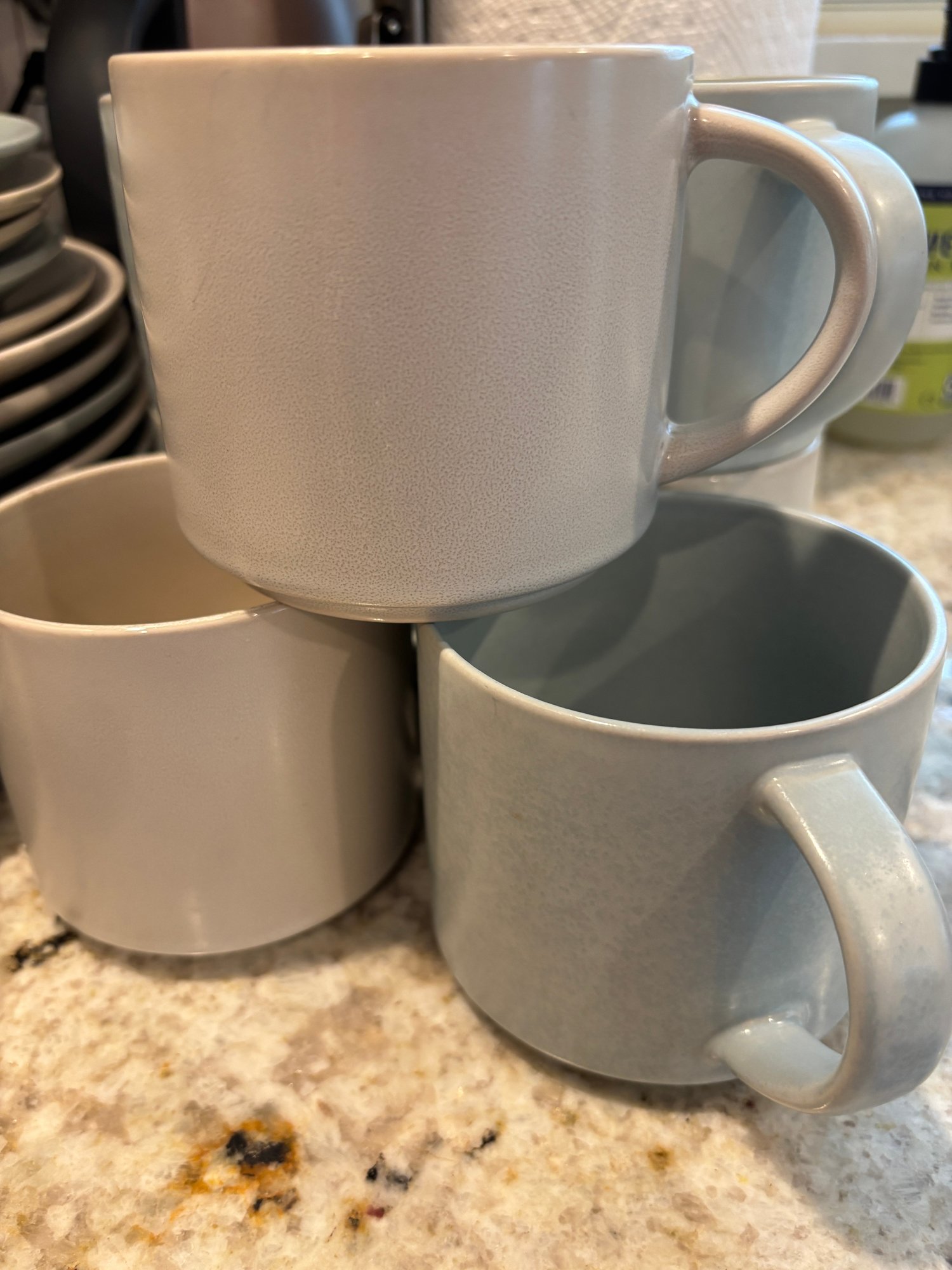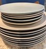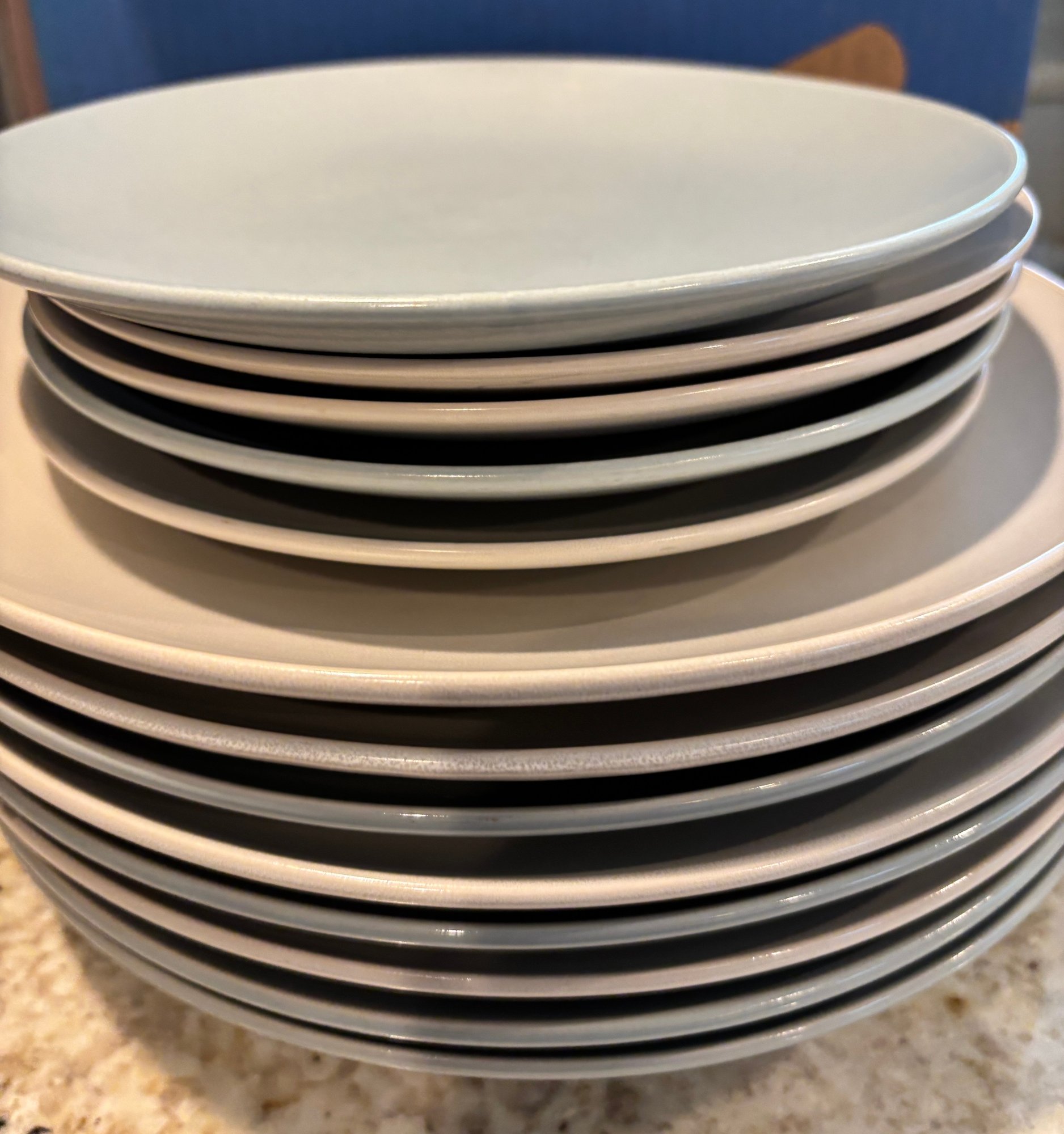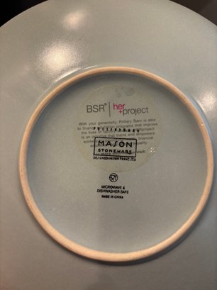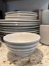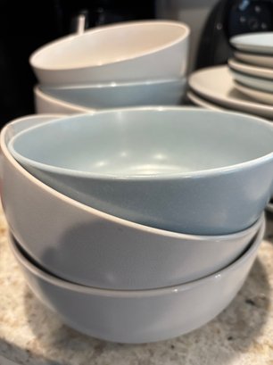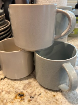 Pottery Barn stoneware. Plates, mugs and bowls in soothing neutral tones of blue and cream/tan.