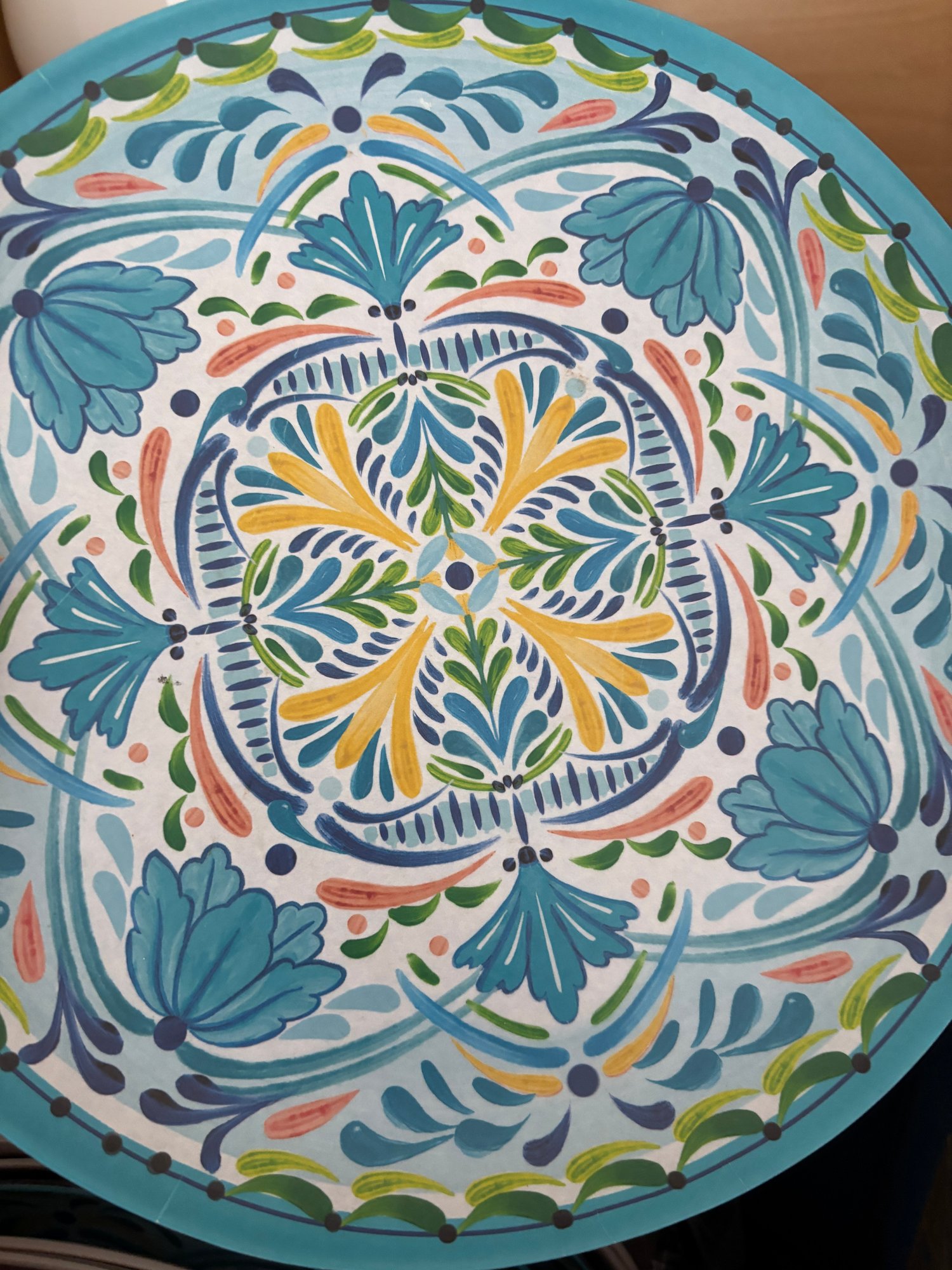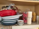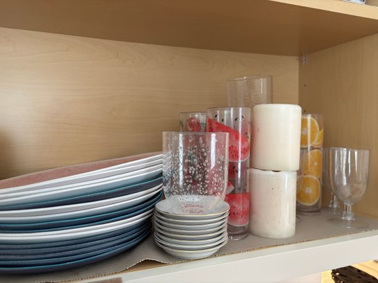 Outdoor entertaining items including plates, glasses, baskets, candles.