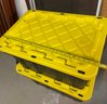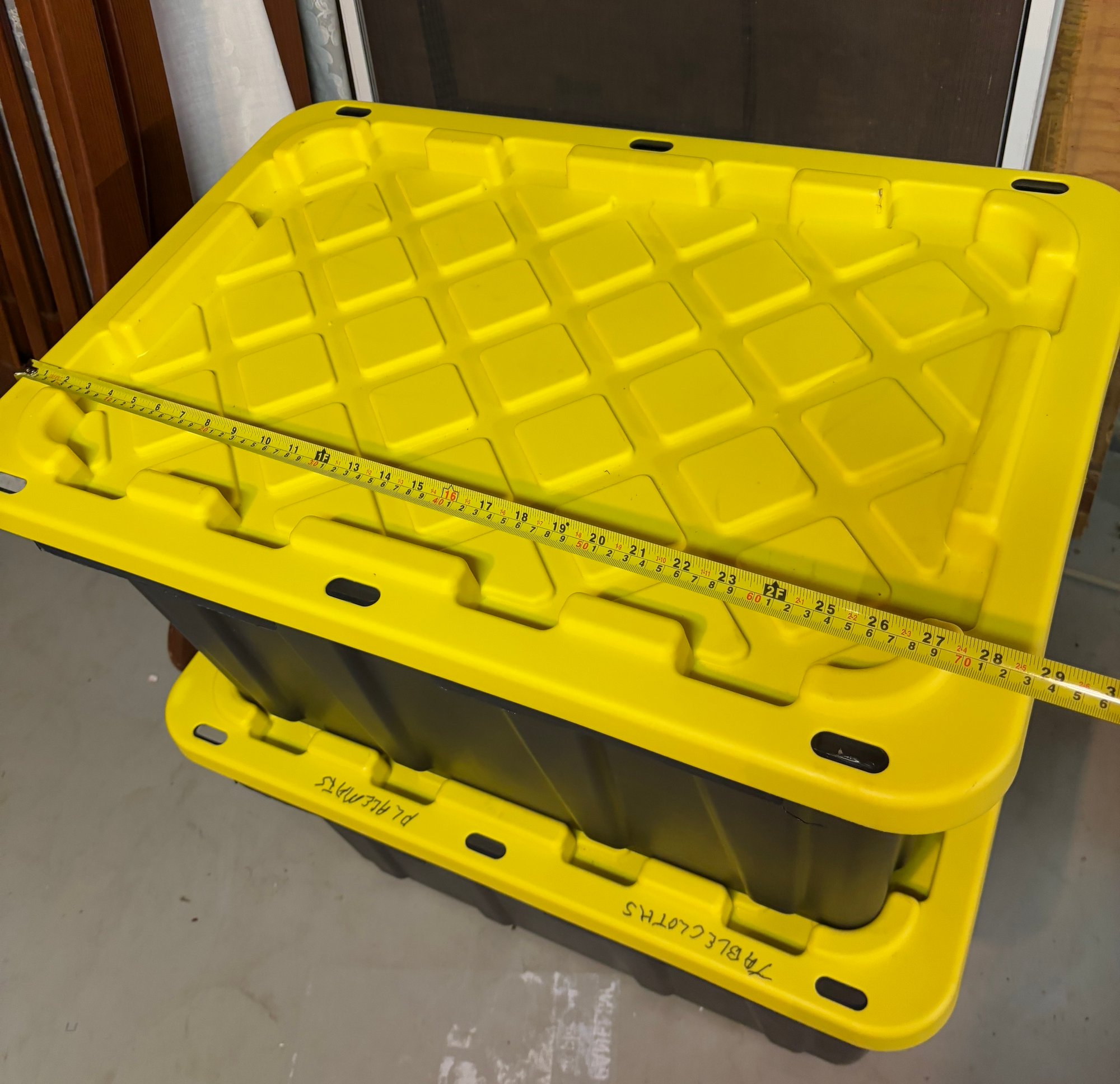 Two totes worth of outdoor entertaining items, including tablecloths and serve wear