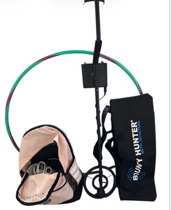 Hula hoop, backpack, baseball items, bounty Hunter metal detector.