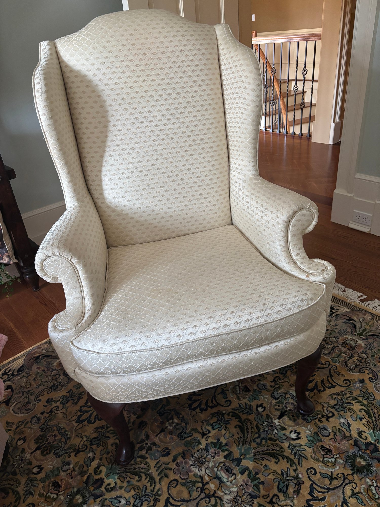 Upholstered in an ivory jacquard patterned upholstery.