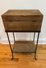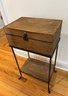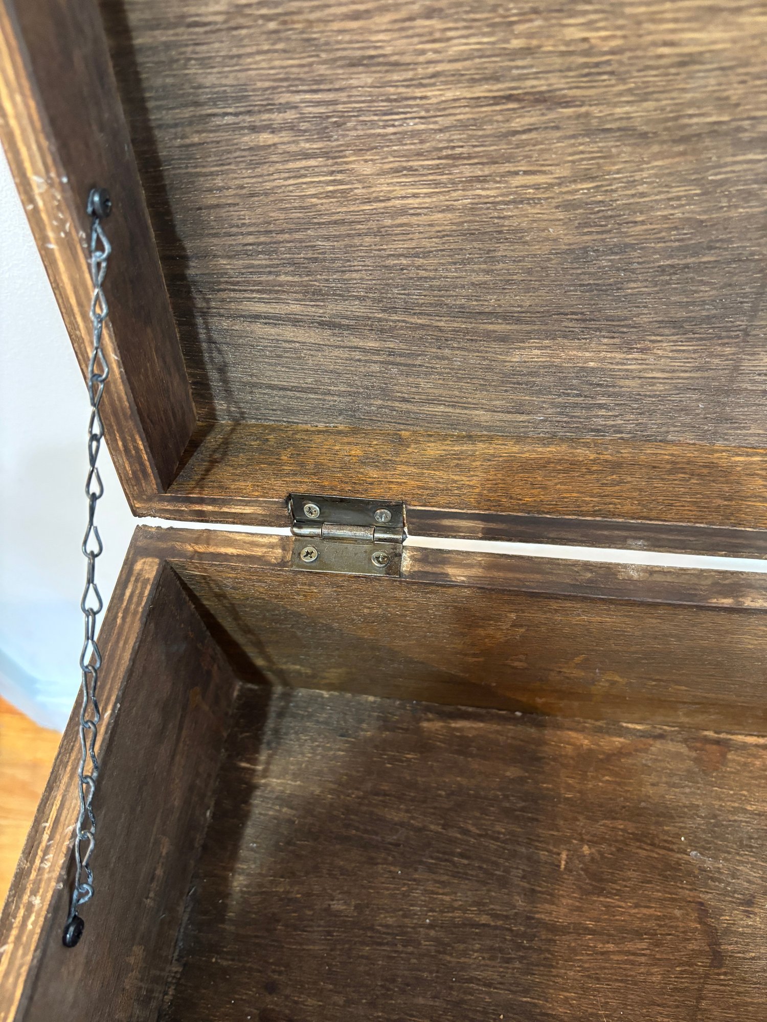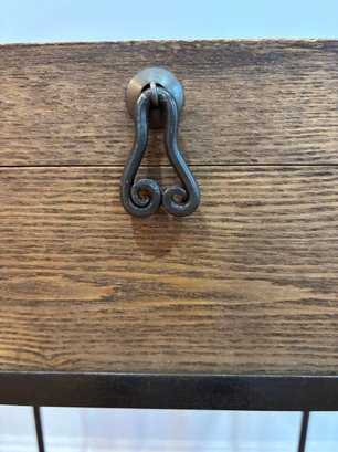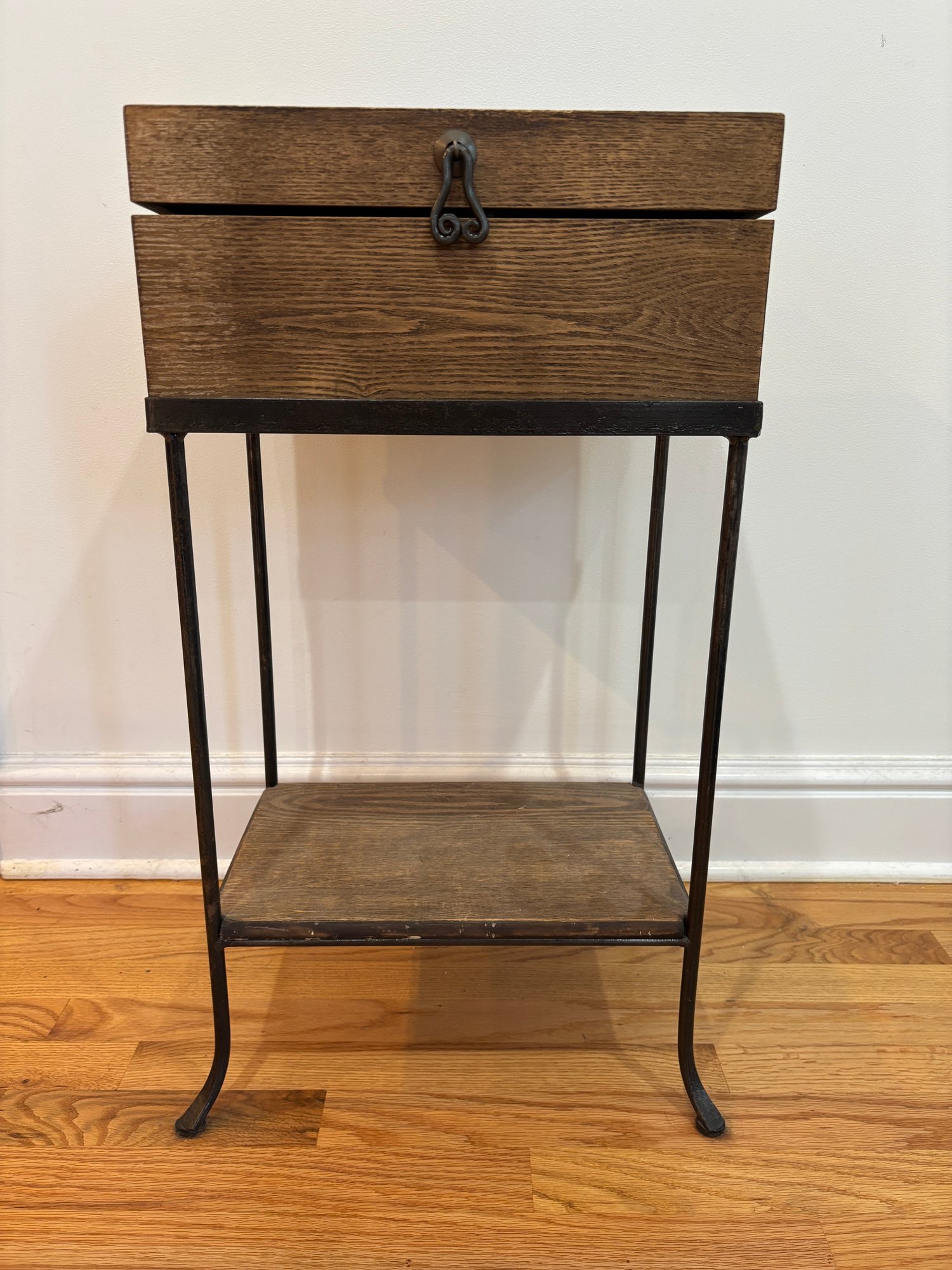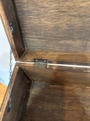 The lid opens and the interior is a great size for storage. Shelf on bottom.