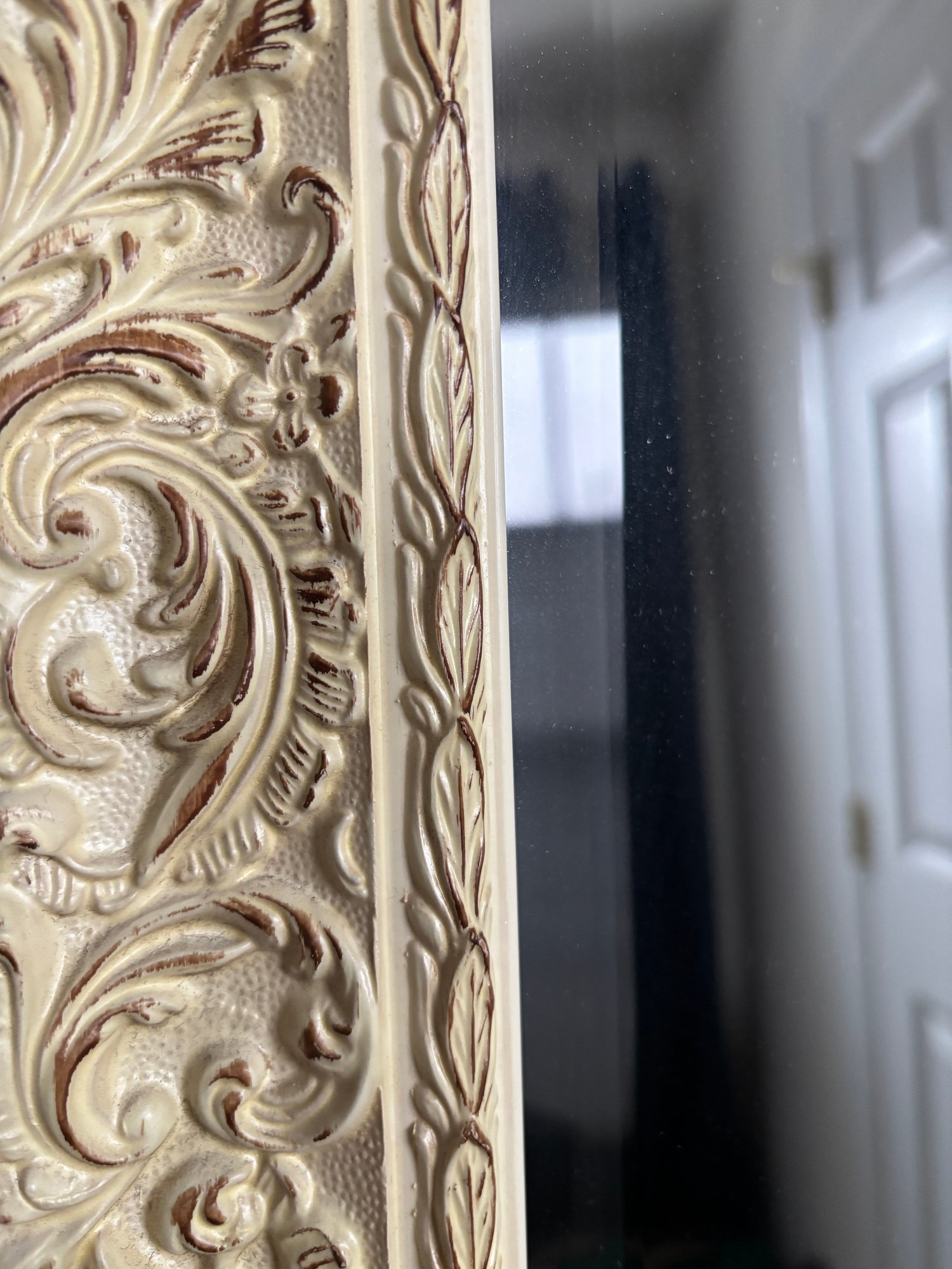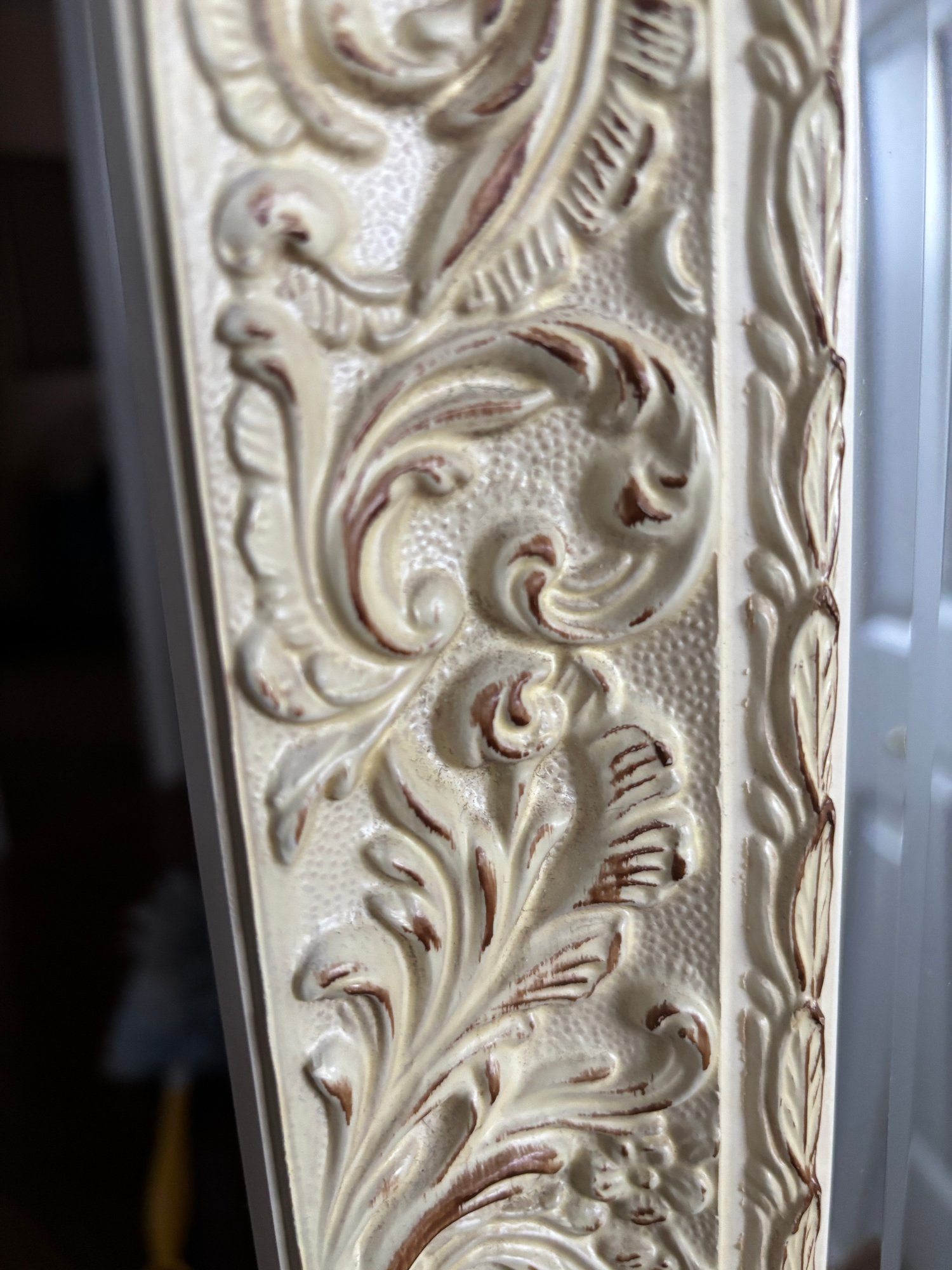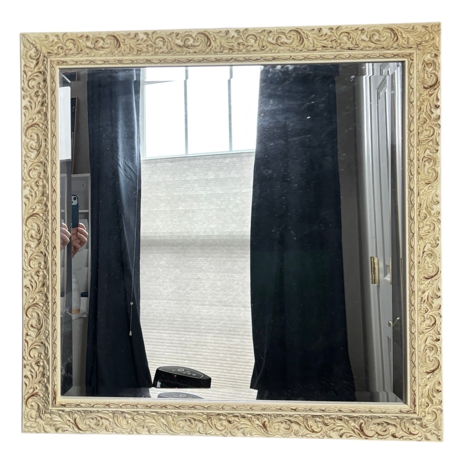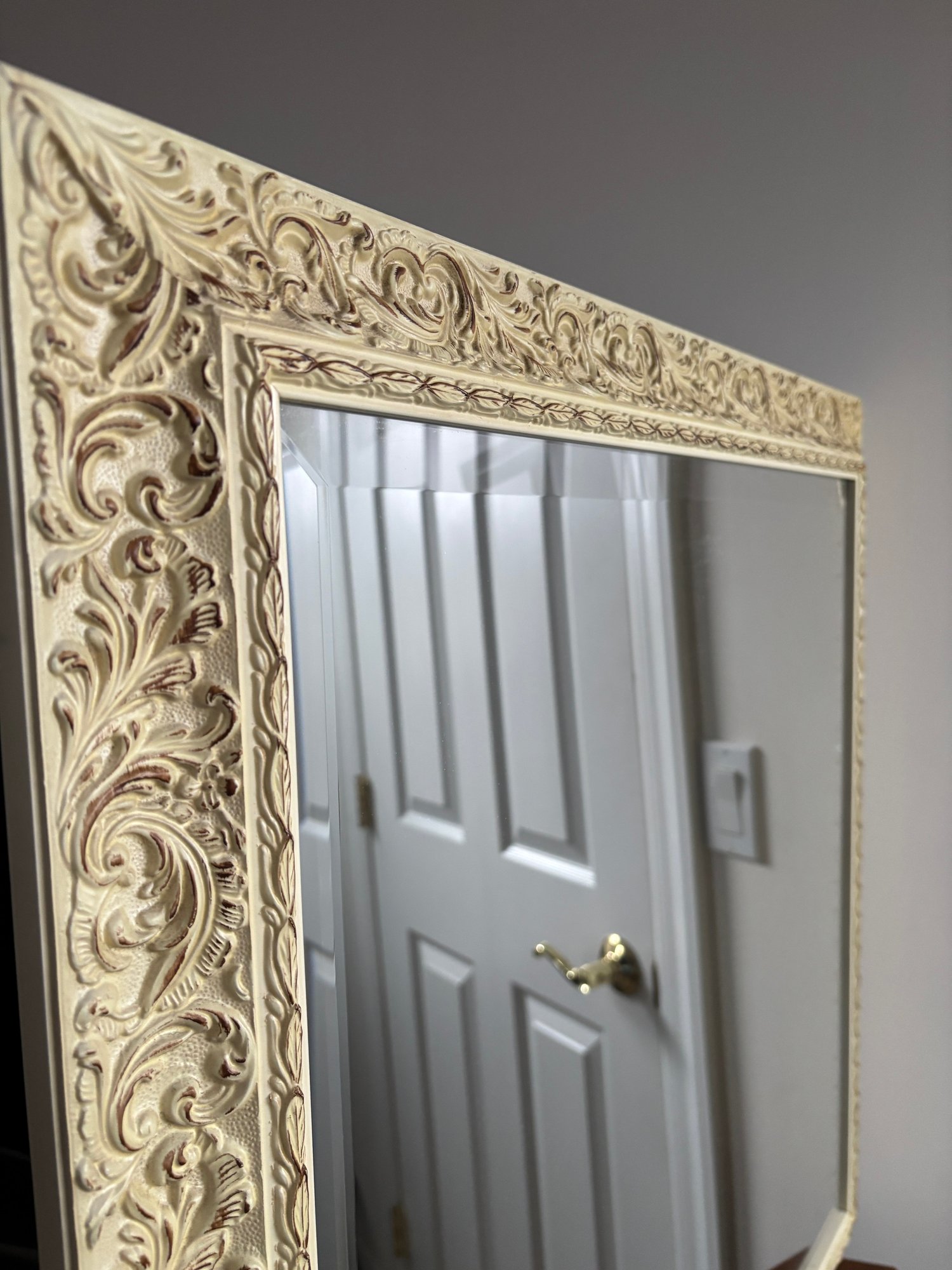 Rustic-style ornate wall mirror features a carved wood/composite frame with leaf pattern