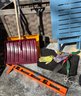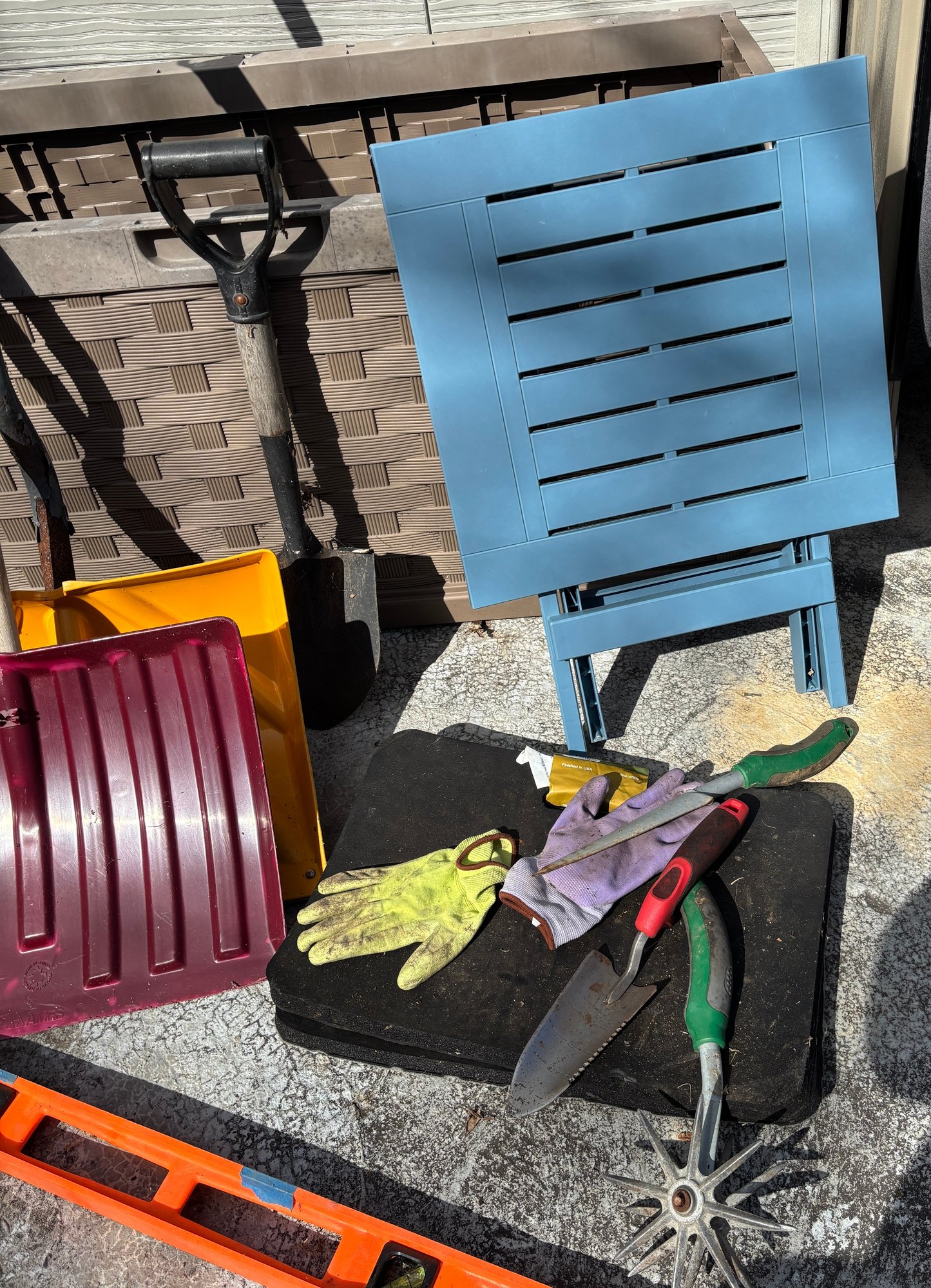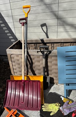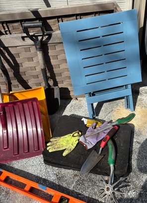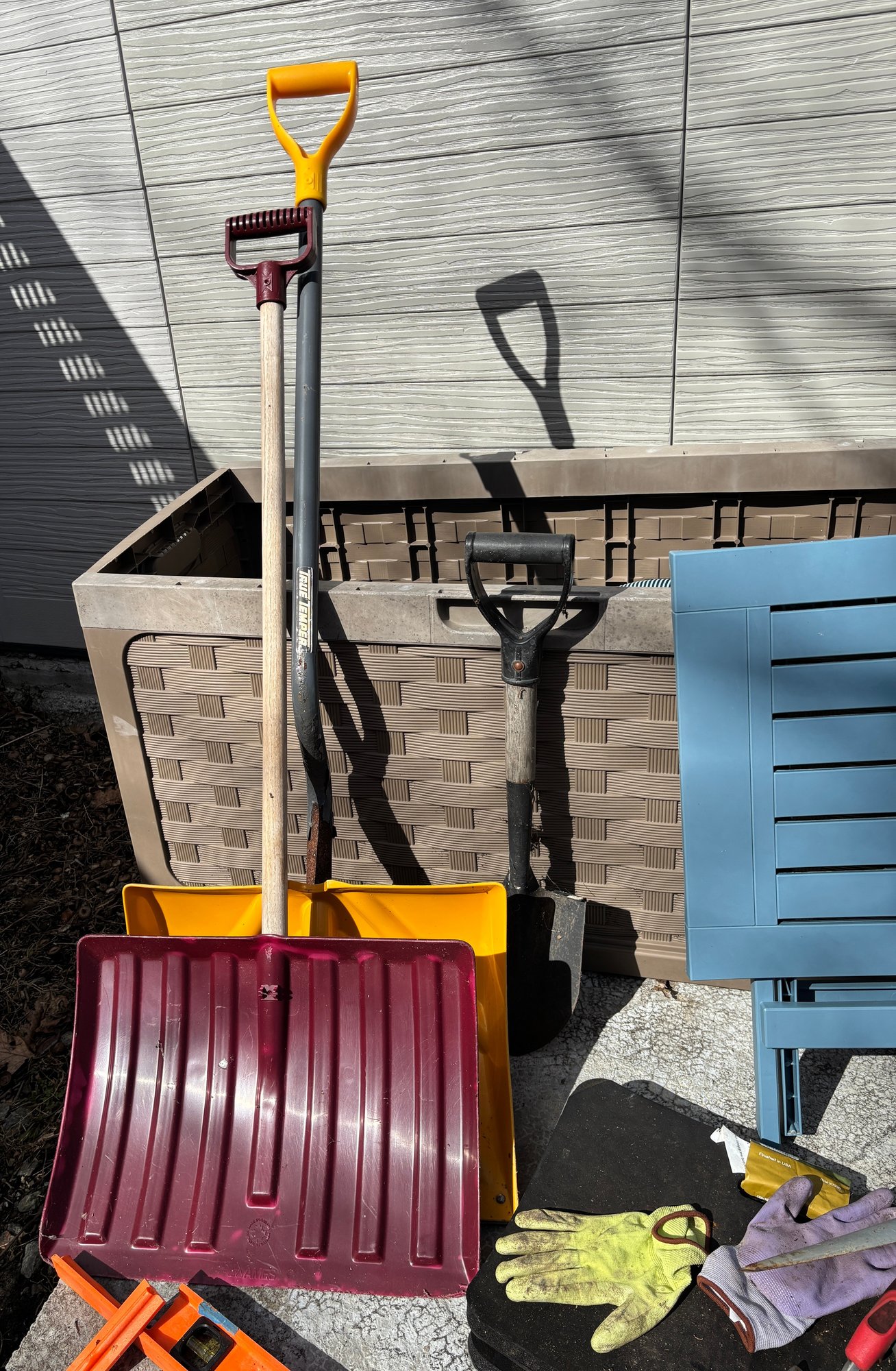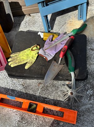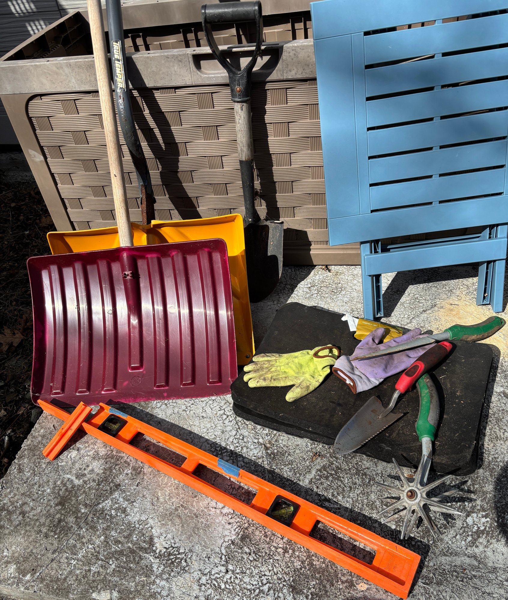 Shovels and assorted tools including a level, pruners and garden gloves.