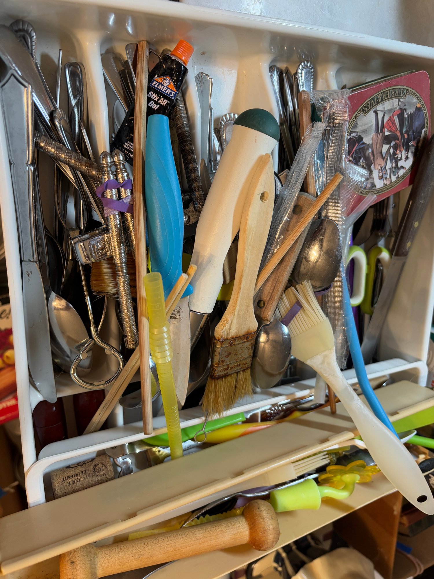 A drawer full of stainless flatware and assorted small kitchen items.
