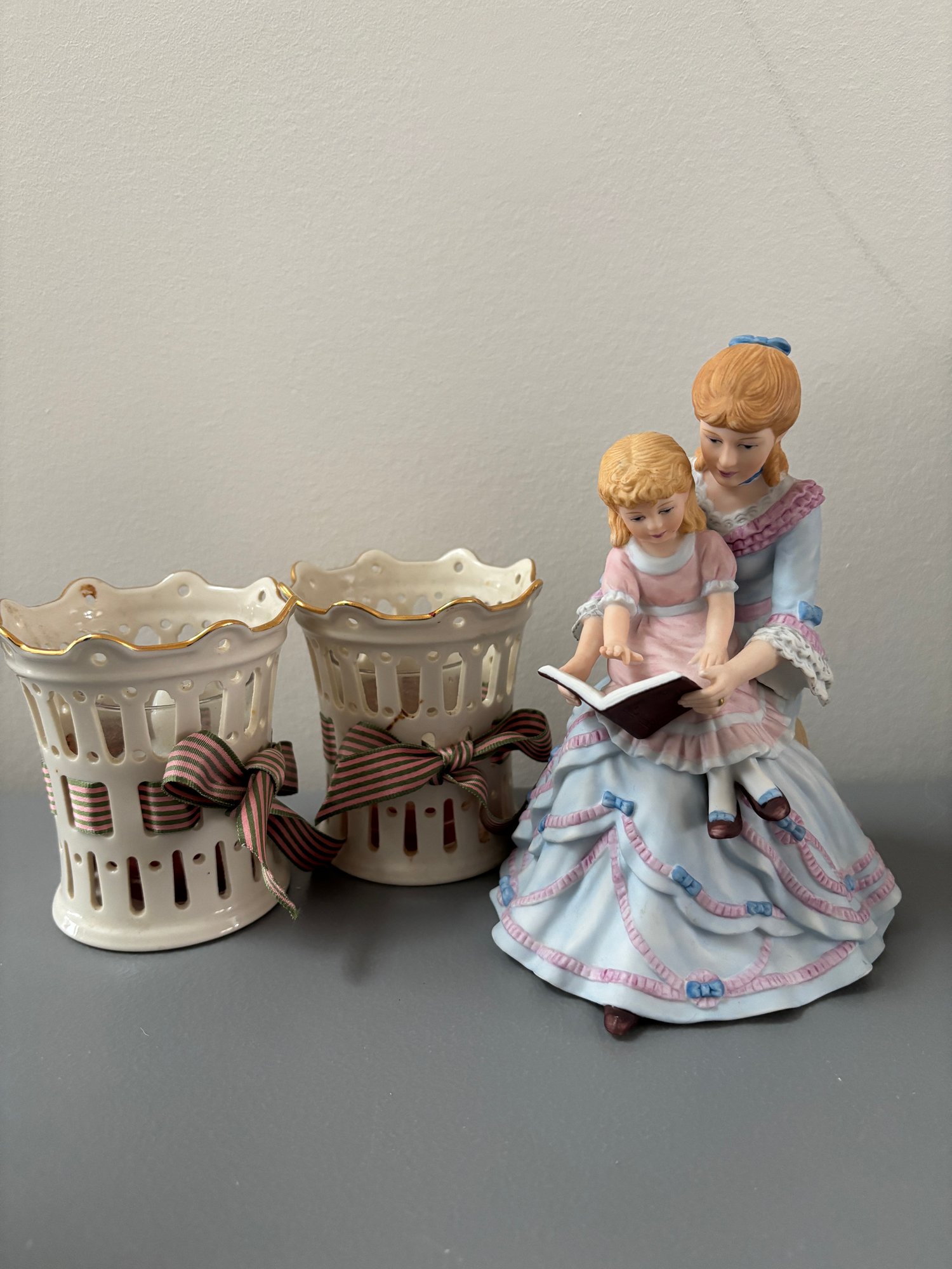 Distinctive Lenox white and gold candleholders with “Storytime” figurine.