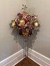 Iron rope detail on stand. The faux flower arrangement features a variety of flowers, including large yellow roses, pink hydrangeas, and orchids.