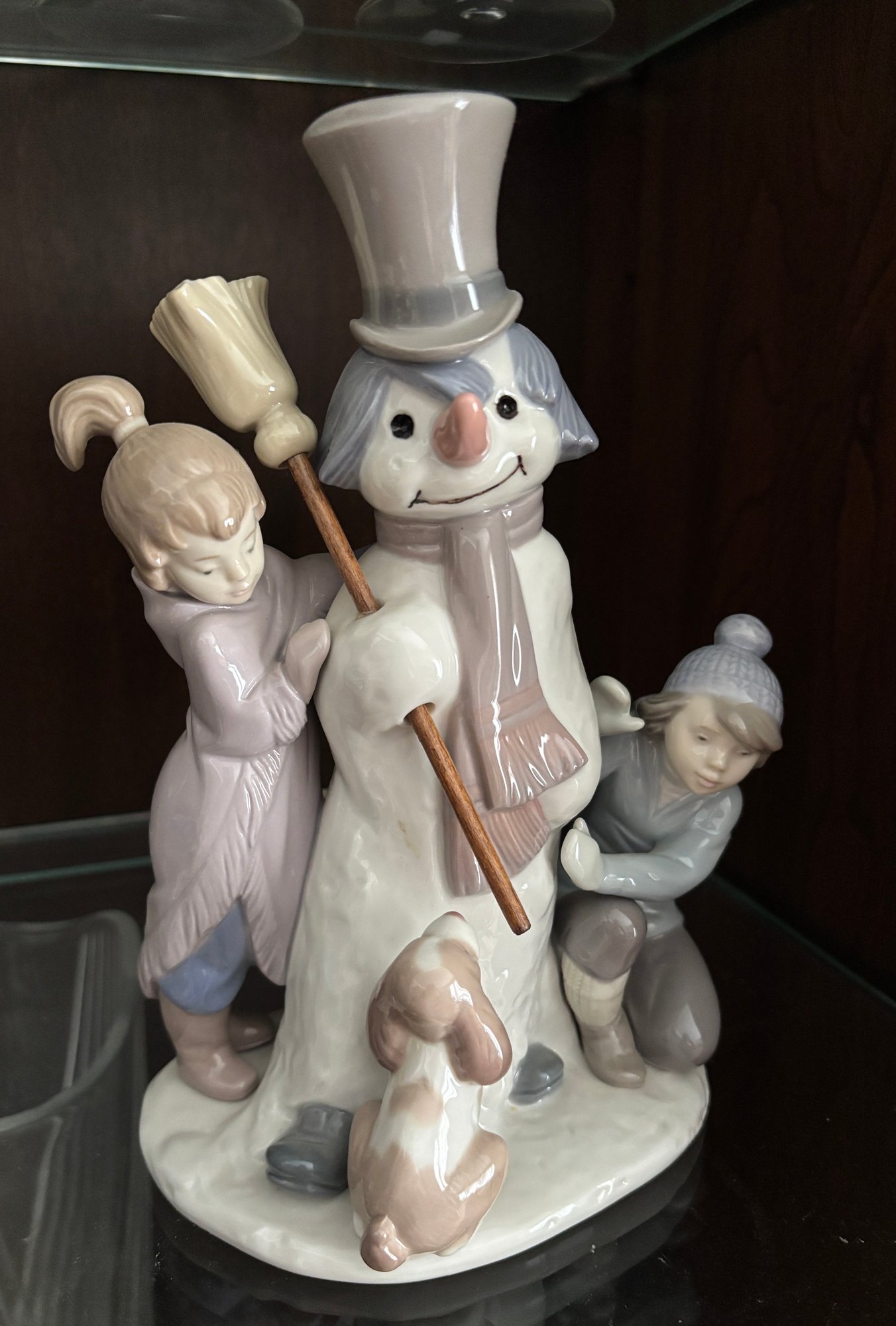 Two children are all bundled up & having lots of fun dressing their snowman. Their adorable pup looks on, waiting for the snowman to come to life!