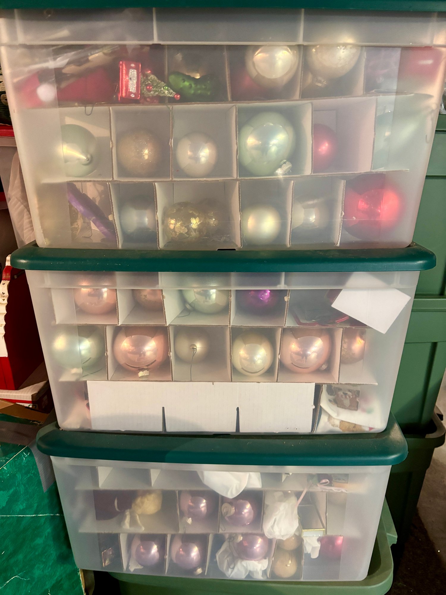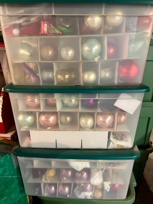 3 tote boxes full of quality christmas ornaments.