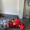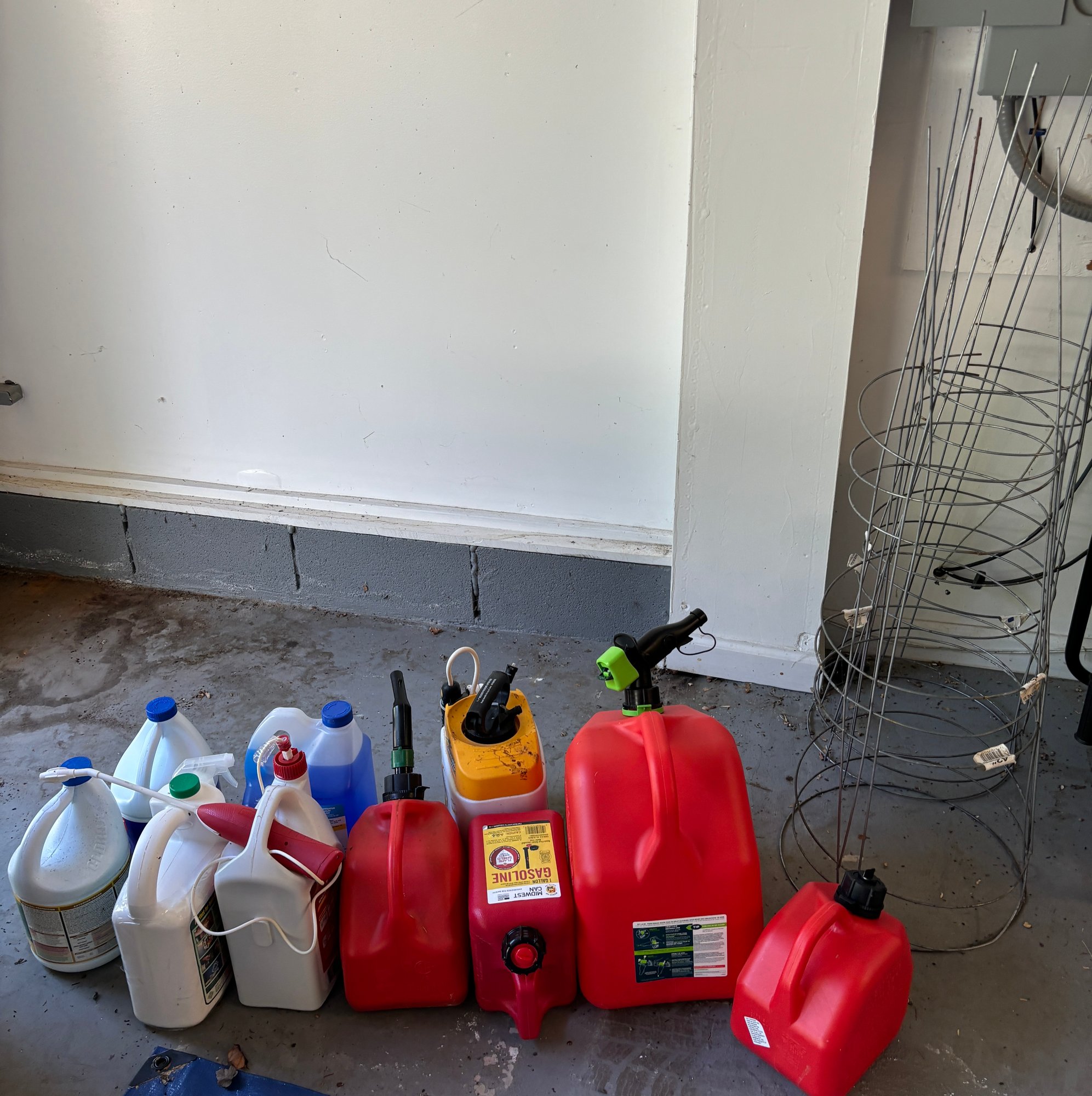 Lot includes tomato cages and an assortment of cleaners and containers.