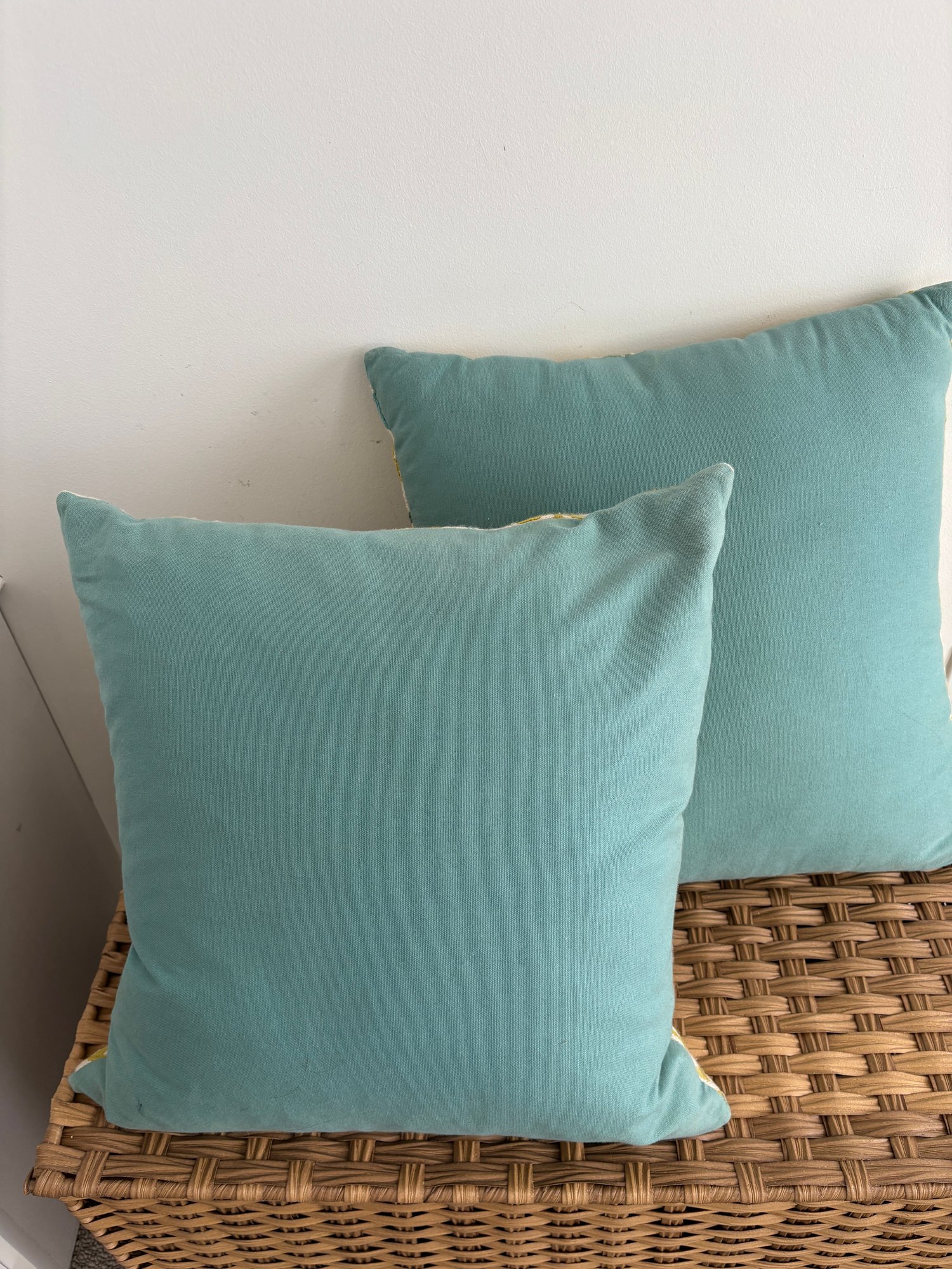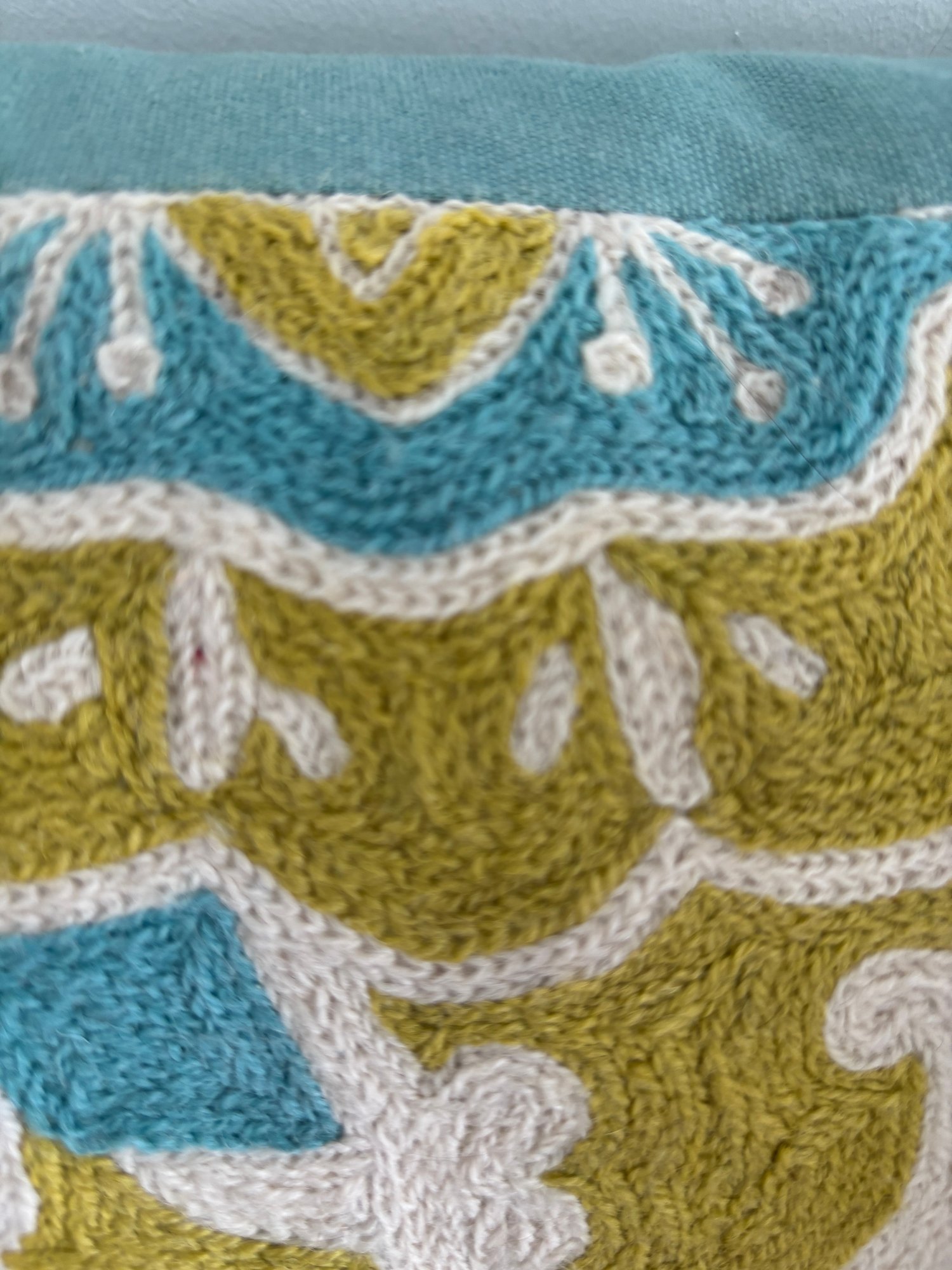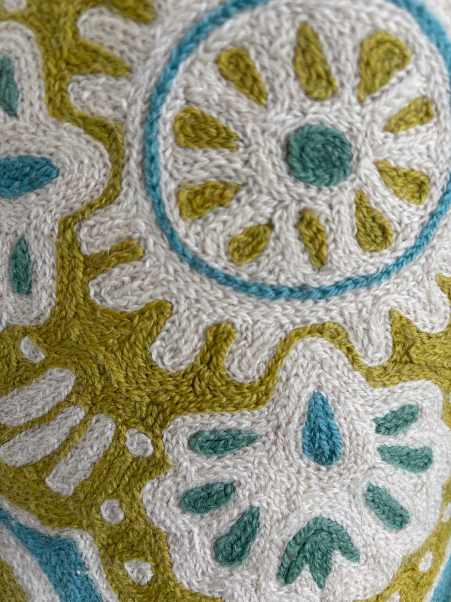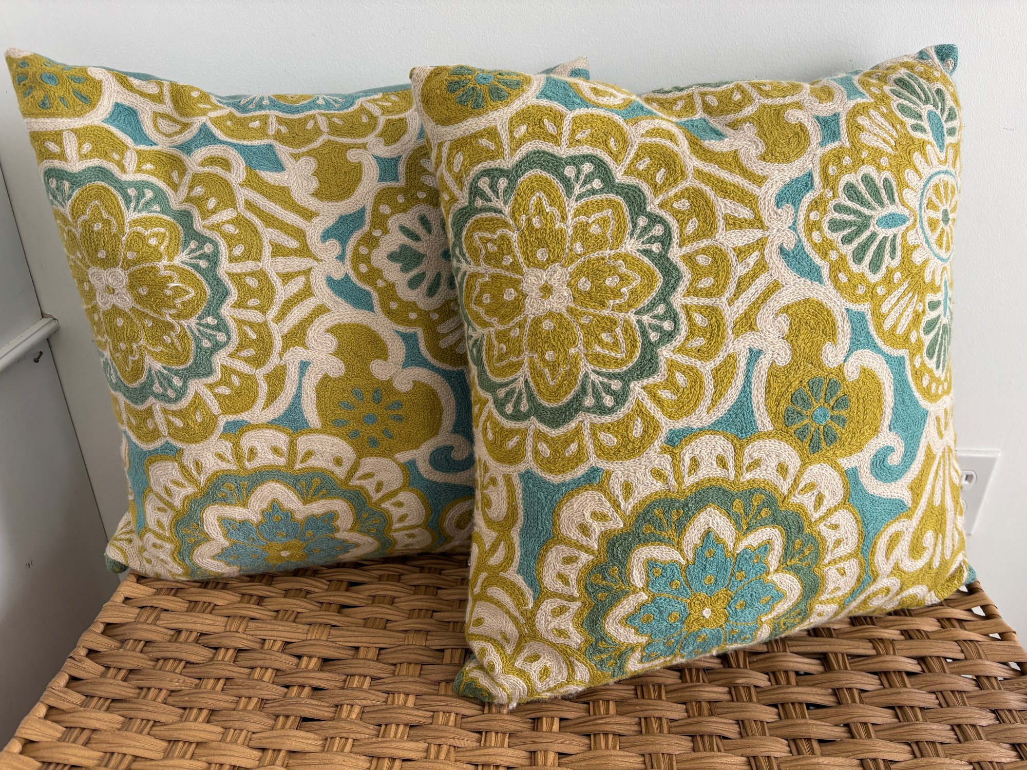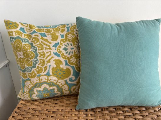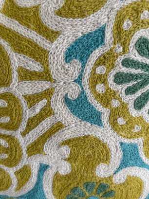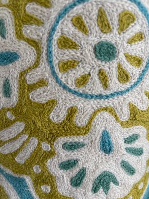 Two throw pillows with a medallion-style pattern in shades of teal, lime green, and off-white. Eye catching texture, design and color. Each are 19" square.