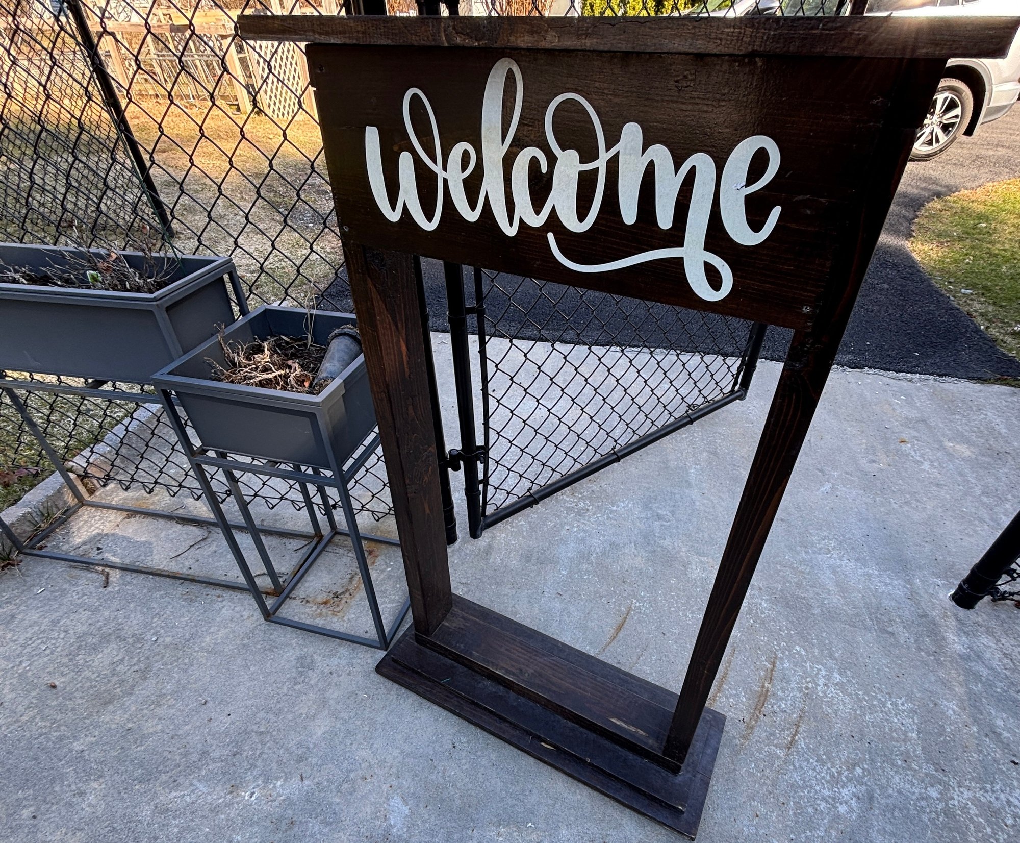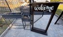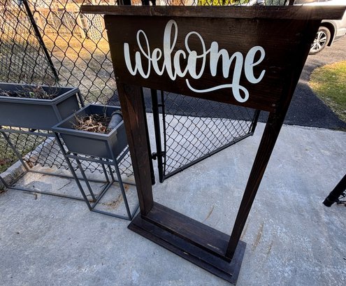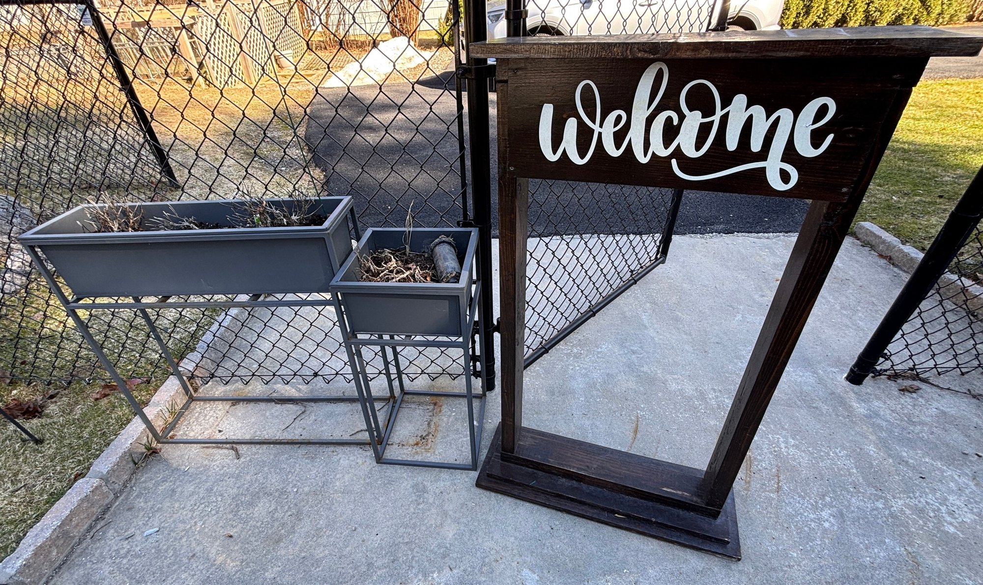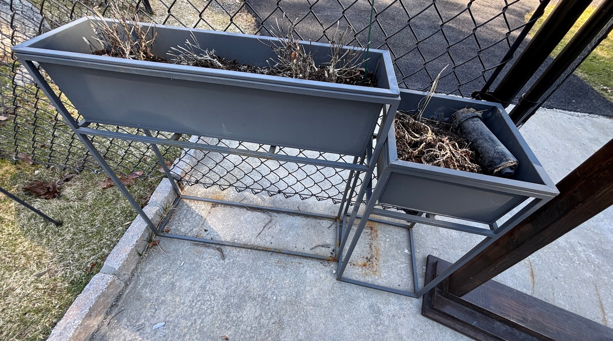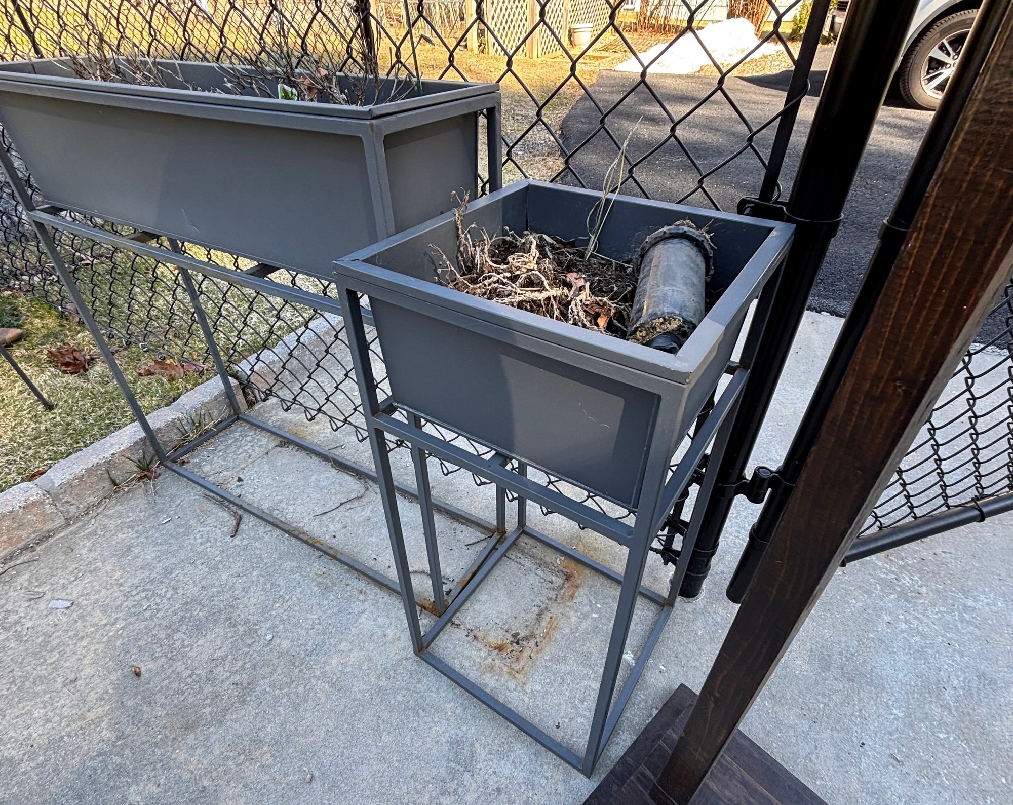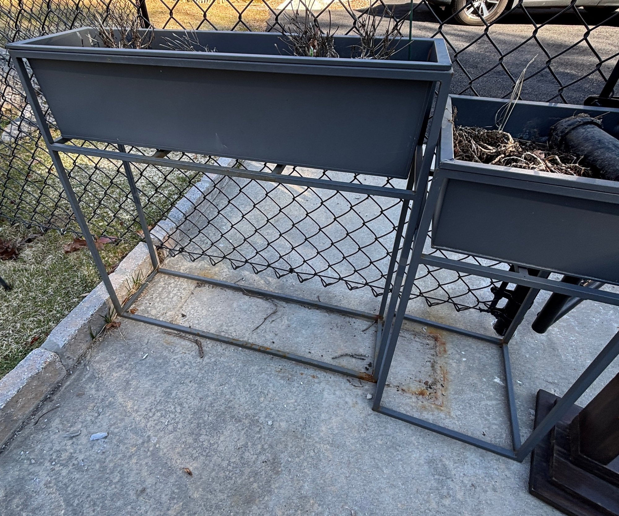 Gray rectangular metal planter boxes set on stands, suitable for decorating patios or gardens.