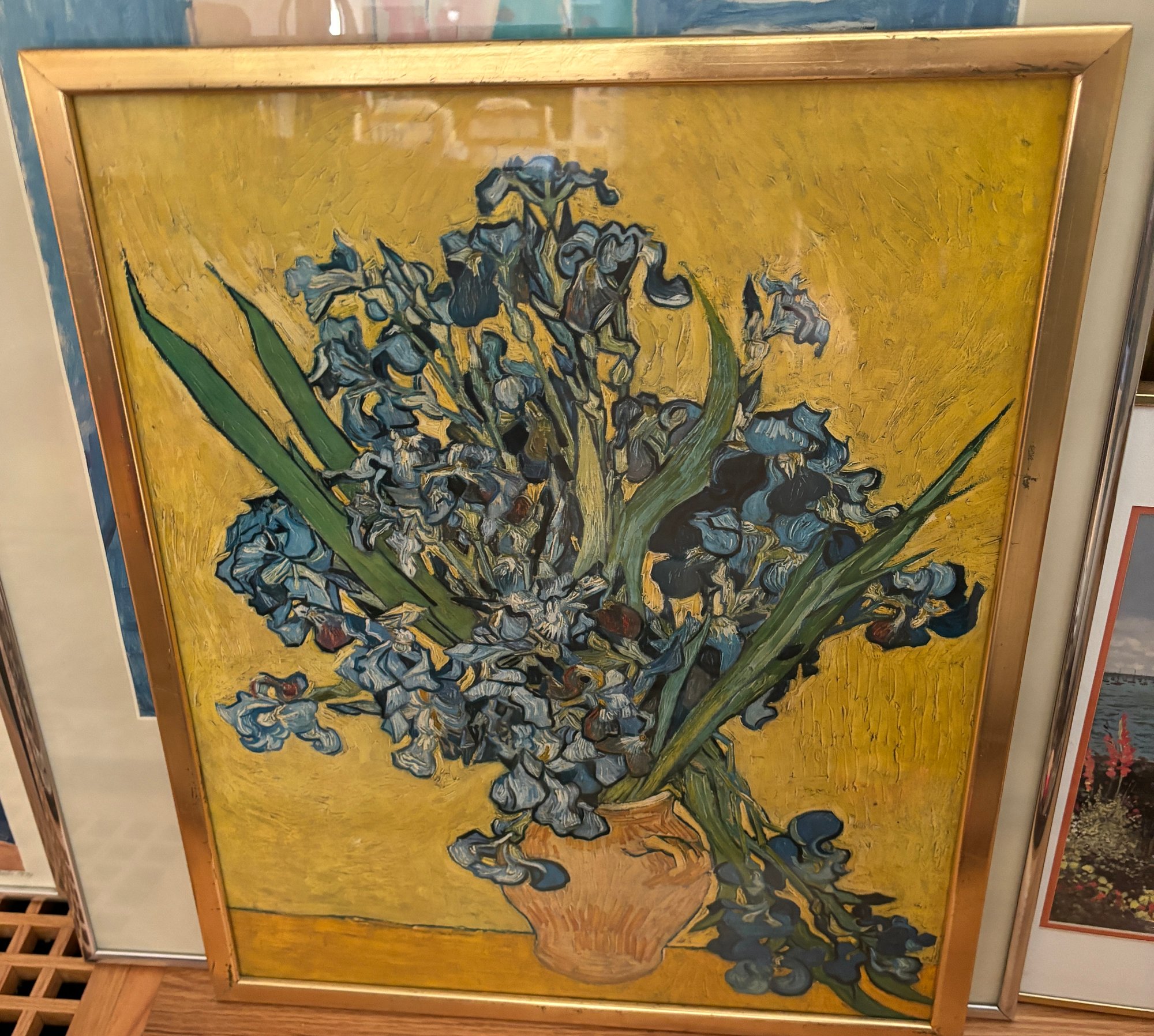 This is a reproduction poster of the original "Irises". Van Gogh painted this still life in Saint-Rémy. For him, the painting was mainly a study in color. He set out to achieve a powerful color contrast. By placing the purple flowers against a yellow background, he made the decorative forms stand out even more strongly. The irises were originally purple. But as the red pigment faded, they turned blue.