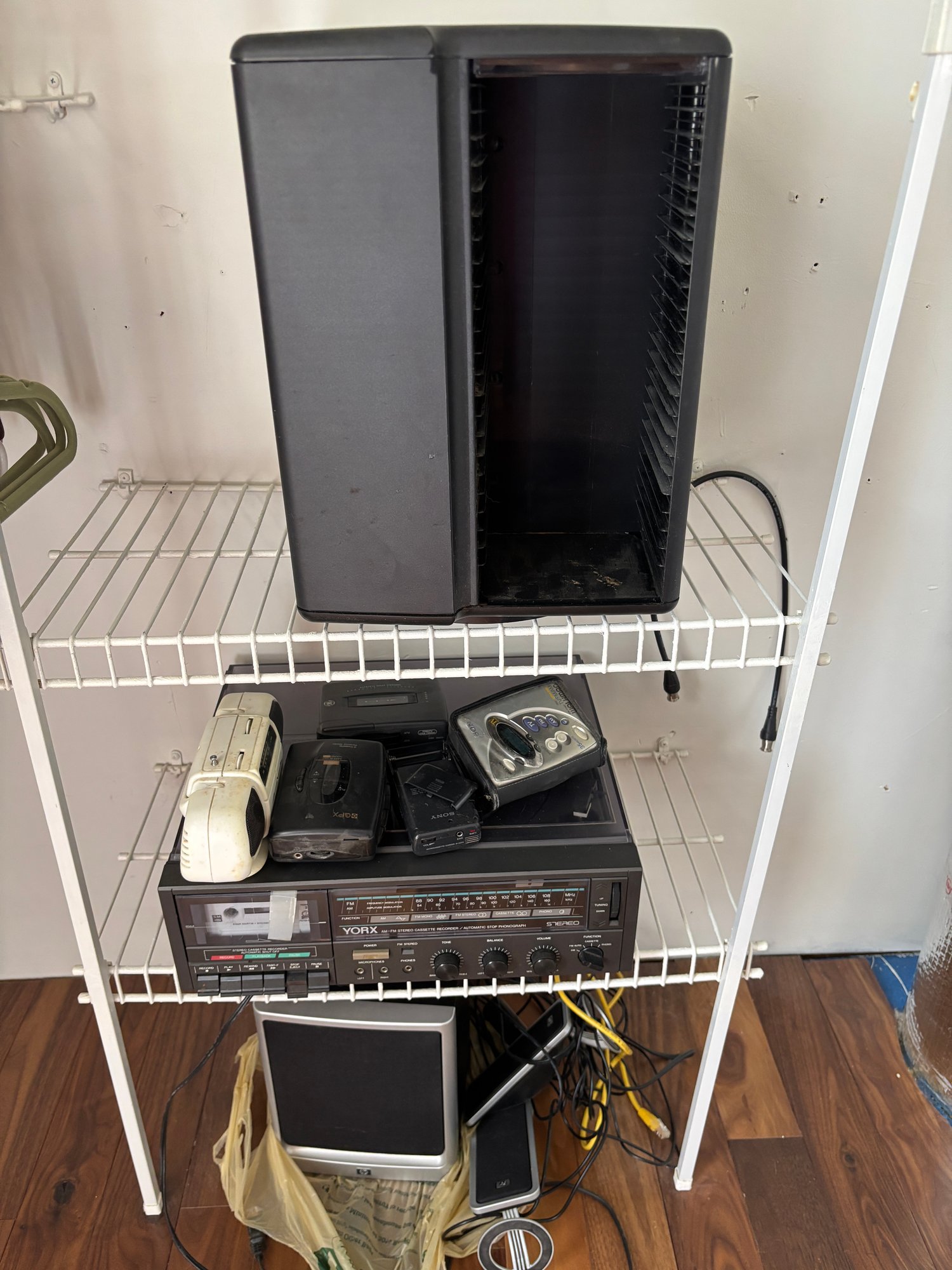 An assortment of vintage electronics from York, GPX, Sony (check out that walkman!), GE and others.