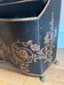 This two-compartment magazine holder features a black background with gilt accents and floral motifs. Hand-painted on metal.